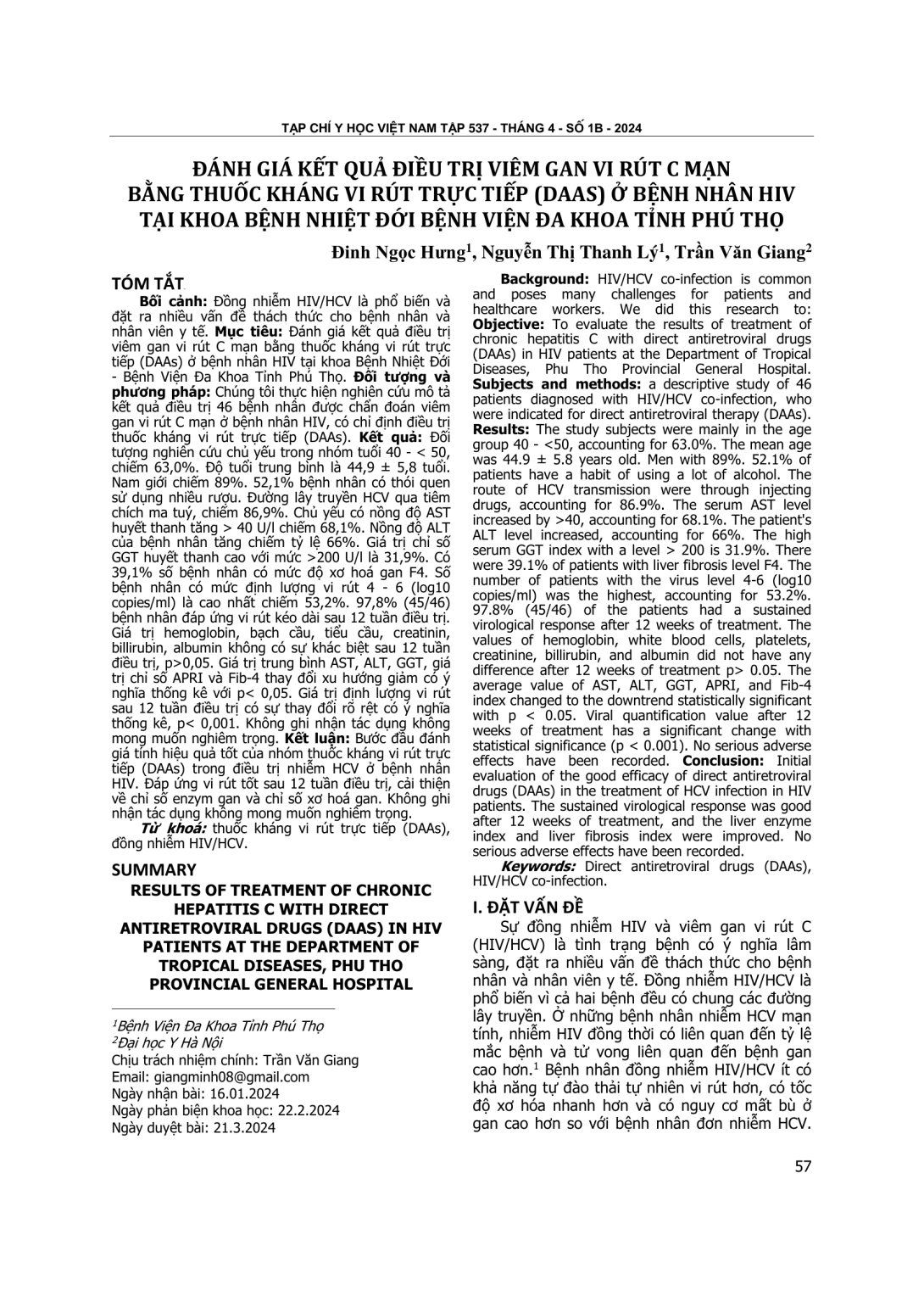 Đánh giá kết quả điều trị viêm gan vi rút C mạn bằng thuốc kháng vi rút trực tiếp (DAAs) ở bệnh nhân HIV tại khoa Bệnh Nhiệt Đới - Bệnh Viện Đa Khoa Tỉnh Phú Thọ. Đối tượng và phương pháp: Chúng tôi thực hiện nghiên cứu mô tả kết quả điều trị 46 bệnh nhân được chẩn đoán viêm gan vi rút C mạn ở bệnh nhân HIV, có chỉ định điều trị thuốc kháng vi rút trực tiếp (DAAs). Kết quả: Đối tượng nghiên cứu chủ yếu trong nhóm tuổi 40 - < 50, chiếm 63,0%. Độ tuổi trung bình là 44,9 ± 5,8 tuổi. Nam giới chiếm 89%. 52,1% bệnh nhân có thói quen sử dụng nhiều rượu. Đường lây truyền HCV qua tiêm chích ma tuý, chiếm 86,9%. Chủ yếu có nồng độ AST huyết thanh tăng > 40 U/l chiếm 68,1%. Nồng độ ALT của bệnh nhân tăng chiếm tỷ lệ 66%. Giá trị chỉ số GGT huyết thanh cao với mức >200 U/l là 31,9%. Có 39,1% số bệnh nhân có mức độ xơ hoá gan F4. Số bệnh nhân có mức định lượng vi rút 4 - 6 (log10 copies/ml) là cao nhất chiếm 53,2%. 97,8% (45/46) bệnh nhân đáp ứng vi rút kéo dài sau 12 tuần điều trị. Giá trị hemoglobin, bạch cầu, tiểu cầu, creatinin, billirubin, albumin không có sự khác biệt sau 12 tuần điều trị, p>0,05. Giá trị trung bình AST, ALT, GGT, giá trị chỉ số APRI và Fib-4 thay đổi xu hướng giảm có ý nghĩa thống kê với p< 0,05. Giá trị định lượng vi rút sau 12 tuần điều trị có sự thay đổi rõ rệt có ý nghĩa thống kê, p< 0,001. Không ghi nhận tác dụng không mong muốn nghiêm trọng. Kết luận: Bước đầu đánh giá tính hiệu quả tốt của nhóm thuốc kháng vi rút trực tiếp (DAAs) trong điều trị nhiễm HCV ở bệnh nhân HIV. Đáp ứng vi rút tốt sau 12 tuần điều trị, cải thiện về chỉ số enzym gan và chỉ số xơ hoá gan. Không ghi nhận tác dụng không mong muốn nghiêm trọng.