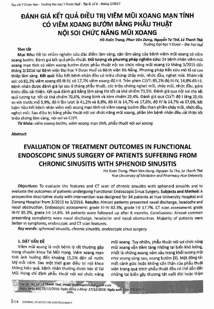 Đánh giá kết quả điều trị viêm mũi xoang mạn tính có viêm xoang bướm bằng phẫu thuật nội soi chức năng mũi xoang trên 34 bệnh nhân tại bệnh viện Đại học Y dược Huế và bệnh viện Đà Nẵng từ 3/2015 đến 3/2016. Kết quả cho thấy sau điều trị bằng phẫu thuật nội soi chức năng mũi xoang, phần lớn bệnh nhân đều cải thiện tốt triệu chứng lâm sàng, nội soi và hình ảnh cắp lớp vi tính.