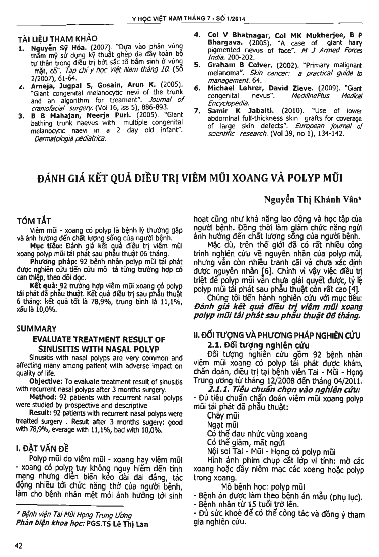 Sinusitis with nasal polyps are very common and affecting many among patient with adverse impact on quality of life. Objective: To evaluate treatment result of sinusitis with recurrent nasal polyps after 3 months surgery. Method: 92 patients with recurrent nasal polyps were studied by prospective and descriptive. Result: 92 patients with recurrent nasal polyps were treatted surgery . Result after 3 months sugery: good with 78,9 percent, everage with 11,1 percent, bad with 10,0 percent.