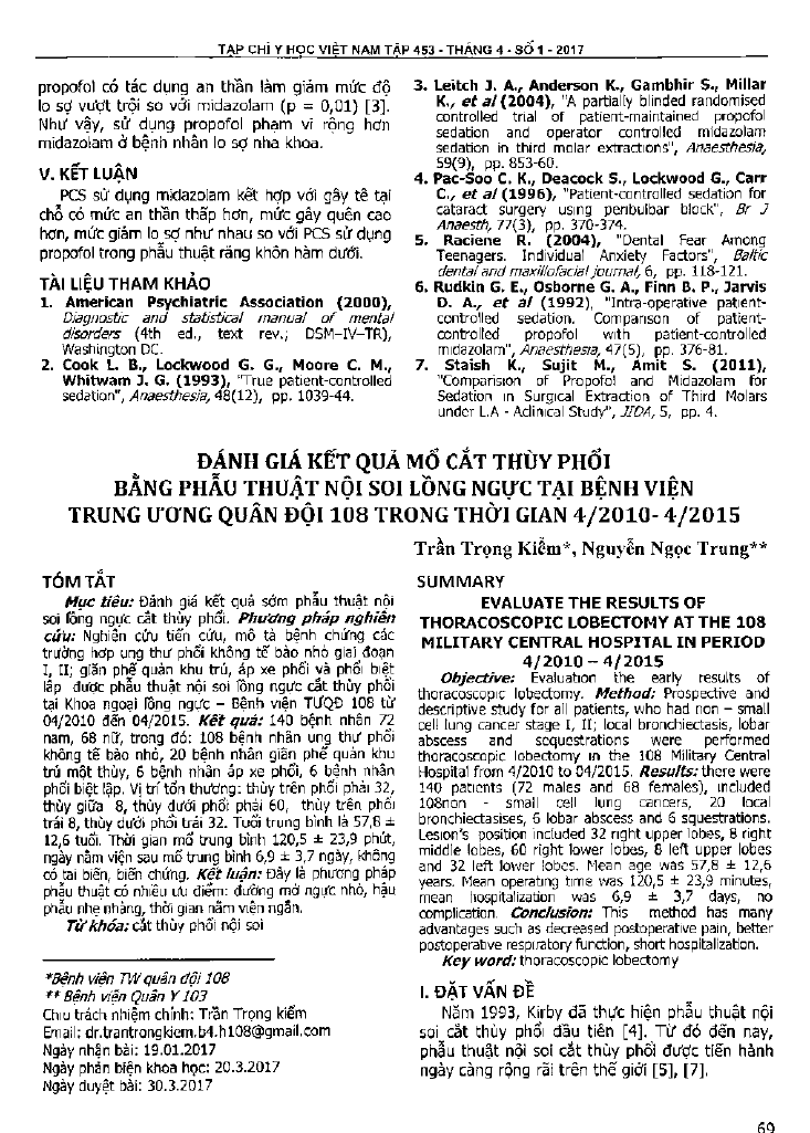 Đánh giá kết quả mổ cắt thùy phổi bằng phẫu thuật nội soi lồng ngực tại bệnh viện Trung ương Quân đội 108 trong thời gian 4/2010 -4/2015