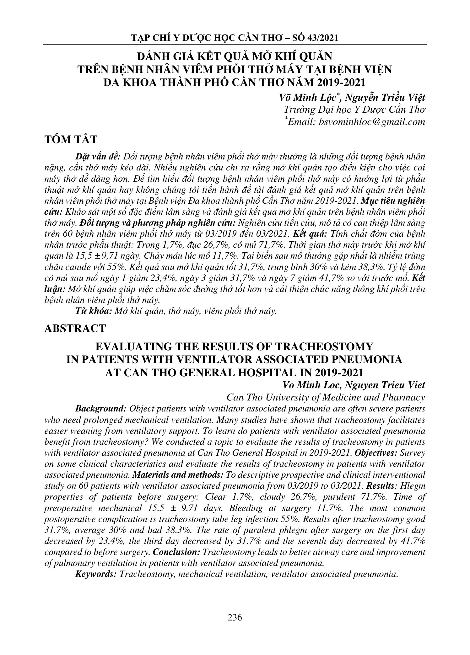 Đối tượng bệnh nhân viêm phổi thở máy thường là những đối tượng bệnh nhân nặng, cần thở máy kéo dài. Nhiều nghiên cứu chỉ ra rằng mở khí quản tạo điều kiện cho việc cai máy thở dễ dàng hơn. Để tìm hiểu đối tượng bệnh nhân viêm phổi thở máy có hưởng lợi từ phẫu thuật mở khí quản hay không chúng tôi tiến hành đề tài đánh giá kết quả mở khí quản trên bệnh nhân viêm phổi thở máy tại Bệnh viện Đa khoa thành phố Cần Thơ năm 2019-2021. Mục tiêu nghiên cứu: Khảo sát một số đặc điểm lâm sàng và đánh giá kết quả mở khí quản trên bệnh nhân viêm phổi thở máy. Đối tượng và phương pháp nghiên cứu: Nghiên cứu tiến cứu, mô tả có can thiệp lâm sàng trên 60 bệnh nhân viêm phổi thở máy từ 03/2019 đến 03/2021. Kết quả: Tính chất đờm của bệnh nhân trước phẫu thuật: Trong 1,7%, đục 26,7%, có mủ 71,7%. Thời gian thở máy trước khi mở khí quản là 15,5 ± 9,71 ngày. Chảy máu lúc mổ 11,7%. Tai biến sau mổ thường gặp nhất là nhiễm trùng chân canule với 55%. Kết quả sau mở khí quản tốt 31,7%, trung bình 30% và kém 38,3%. Tỷ lệ đờm có mủ sau mổ ngày 1 giảm 23,4%, ngày 3 giảm 31,7% và ngày 7 giảm 41,7% so với trước mổ. Kết luận: Mở khí quản giúp việc chăm sóc đường thở tốt hơn và cải thiện chức năng thông khí phổi trên bệnh nhân viêm phổi thở máy.