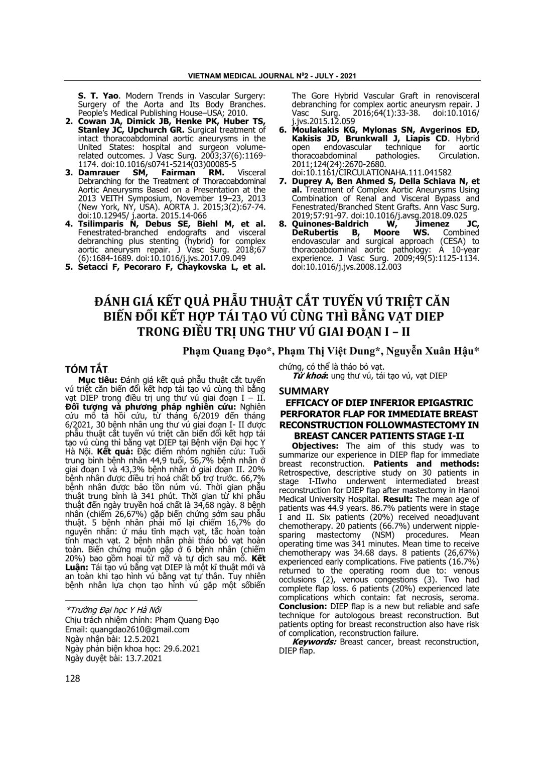 Đánh giá kết quả phẫu thuật cắt tuyến vú triệt căn biến đổi kết hợp tái tạo vú cùng thì bằng vạt DIEP trong điều trị ung thư vú giai đoạn I – II. Nghiên cứu mô tả hồi cứu, từ tháng 6/2019 đến tháng 6/2021, 30 bệnh nhân ung thư vú giai đoạn I- II được phẫu thuật cắt tuyến vú triệt căn biến đổi kết hợp tái tạo vú cùng thì bằng vạt DIEP tại Bệnh viện Đại học Y Hà Nội. Kết quả: Đặc điểm nhóm nghiên cứu: Tuổi trung bình bệnh nhân 44,9 tuổi, 56,7% bệnh nhân ở giai đoạn I và 43,3% bệnh nhân ở giai đoạn II. 20% bệnh nhân được điều trị hoá chất bổ trợ trước. 66,7% bệnh nhân được bảo tồn núm vú. Thời gian phẫu thuật trung bình là 341 phút. Thời gian từ khi phẫu thuật đến ngày truyền hoá chất là 34,68 ngày. 8 bệnh nhân (chiếm 26,67%) gặp biến chứng sớm sau phẫu thuật. 5 bệnh nhân phải mổ lại chiếm 16,7% do nguyên nhân: ứ máu tĩnh mạch vạt, tắc hoàn toàn tĩnh mạch vạt. 2 bệnh nhân phải tháo bỏ vạt hoàn toàn. Biến chứng muộn gặp ở 6 bệnh nhân (chiếm 20%) bao gồm hoại tử mỡ và tự dịch sau mổ. Kết Luận: Tái tạo vú bằng vạt DIEP là một kĩ thuật mới và an toàn khi tạo hình vú bằng vạt tự thân. Tuy nhiên bệnh nhân lựa chọn tạo hình vú gặp một số biến chứng, có thể là tháo bỏ vạt