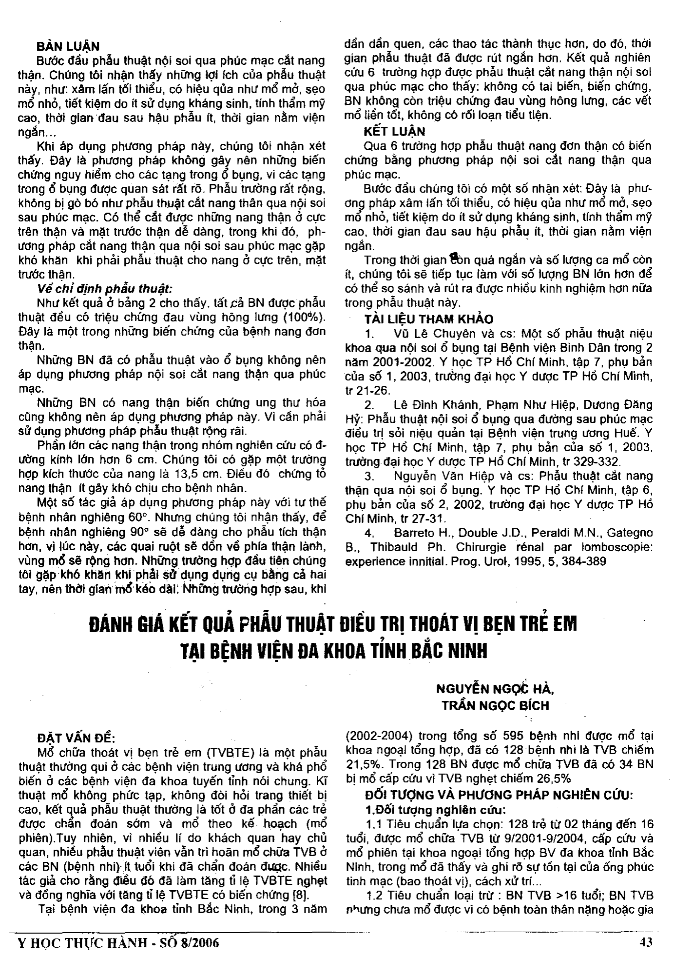 Qua 128 bệnh nhi được mổ chữa thoát vị bẹn (TVB) tại BV đa khoa Bắc Ninh từ 9/2001 đến 9/2003 tuổi trung bình khi chẩn đoán là 3,14 năm, khi mổ tuổi là 5,85, tỷ lệ mổ cấp cứu chiếm 26,5% . Kết quả tốt đối với mổ phien trên 91% , mổ cấp cứu trên 64% . Lý do mổ muộn là do gia định được tư vấn nên mổ sau 6 tuổi.