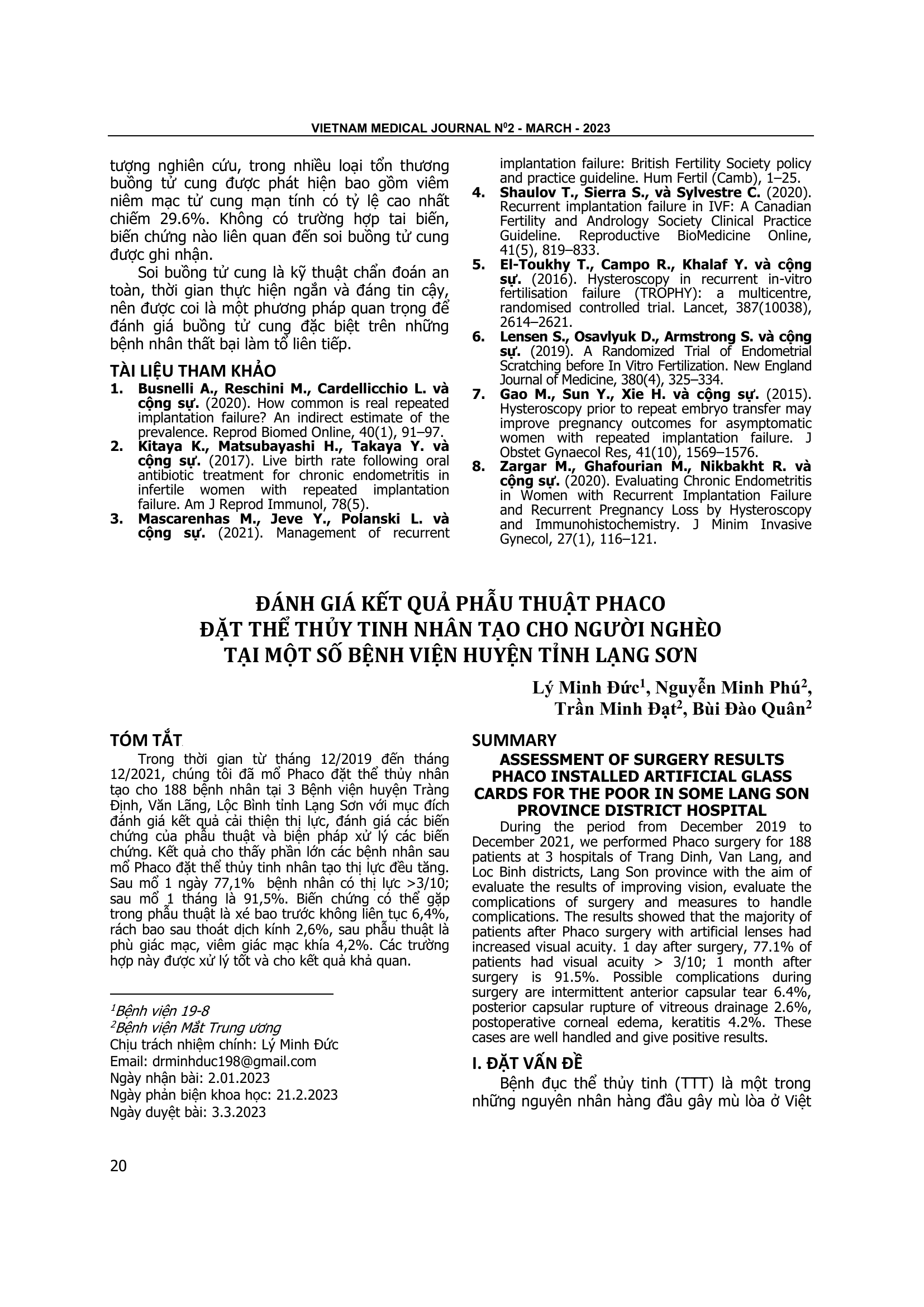 Trong thời gian từ tháng 12/2019 đến tháng 12/2021, chúng tôi đã mổ Phaco đặt thể thủy nhân tạo cho 188 bệnh nhân tại 3 Bệnh viện huyện Tràng Định, Văn Lãng, Lộc Bình tỉnh Lạng Sơn với mục đích đánh giá kết quả cải thiện thị lực, đánh giá các biến chứng của phẫu thuật và biện pháp xử lý các biến chứng. Kết quả cho thấy phần lớn các bệnh nhân sau mổ Phaco đặt thể thủy tinh nhân tạo thị lực đều tăng. Sau mổ 1 ngày 77,1% bệnh nhân có thị lực >3/10; sau mổ 1 tháng là 91,5%. Biến chứng có thể gặp trong phẫu thuật là xé bao trước không liên tục 6,4%, rách bao sau thoát dịch kính 2,6%, sau phẫu thuật là phù giác mạc, viêm giác mạc khía 4,2%. Các trường hợp này được xử lý tốt và cho kết quả khả quan.