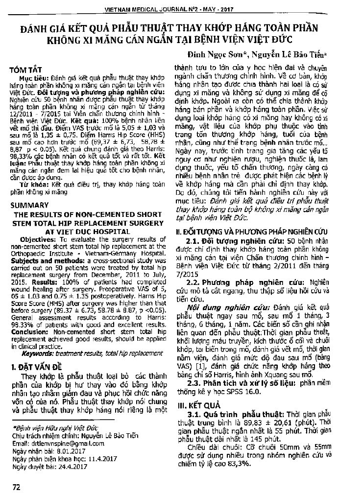 Đánh giá kết quả phẫu thuật thay khớp háng toàn phần không xi măng cán ngắn trên 50 bệnh nhân tại Bệnh viện Việt Đức từ 12/2011 đến 7/2015. Kết quả cho thấy phẫu thuật thay khớp háng toàn phần không xi măng cán ngắn đem lại hiệu quả tốt cho bệnh nhân, cần được áp dụng.