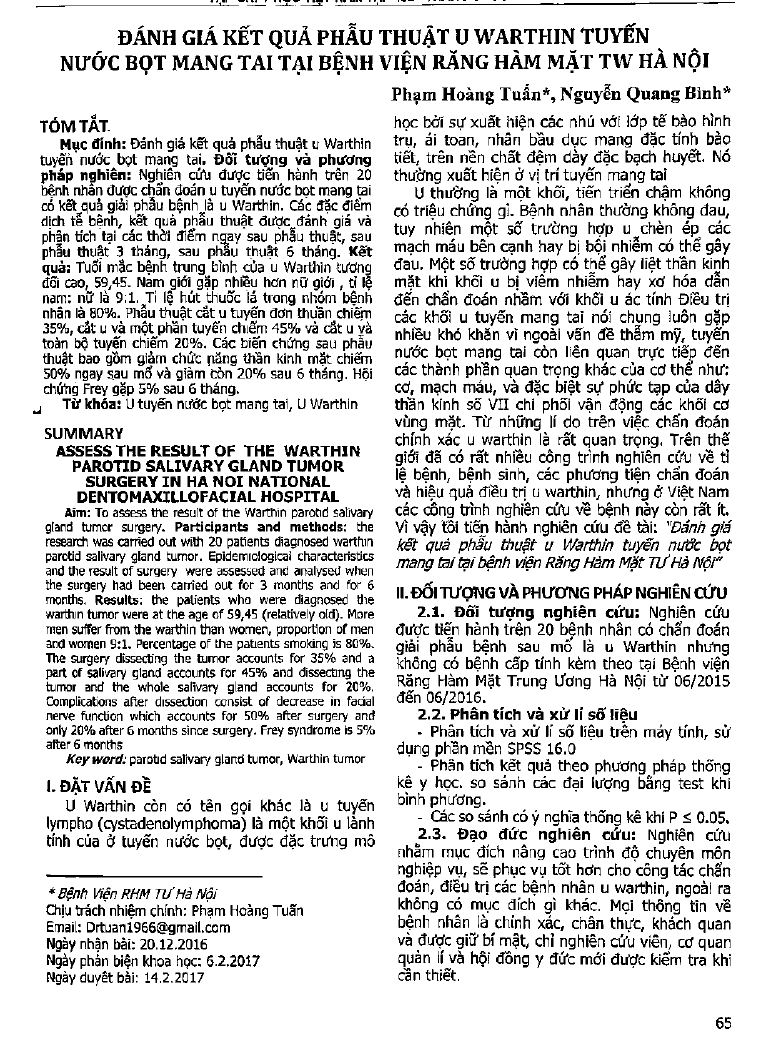 Đánh giá kết quả phẫu thuật u Warthin tuyến nước bọt mang tai tại bệnh viện Răng hàm mặt Trung ương, Hà Nội
