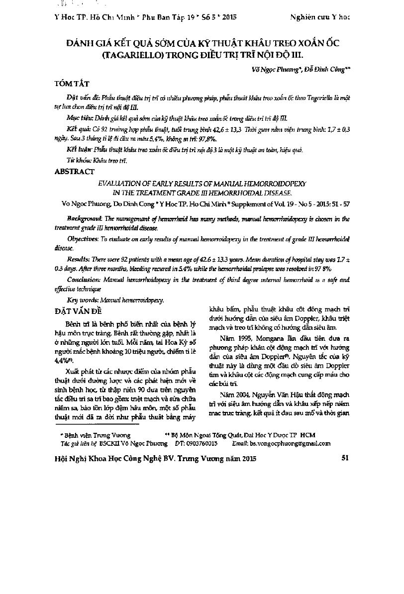 Đánh giá kết quả sớm của kỹ thuật khâu treo xoắn ốc (Tagariello) trong điều trị trĩ nội độ III