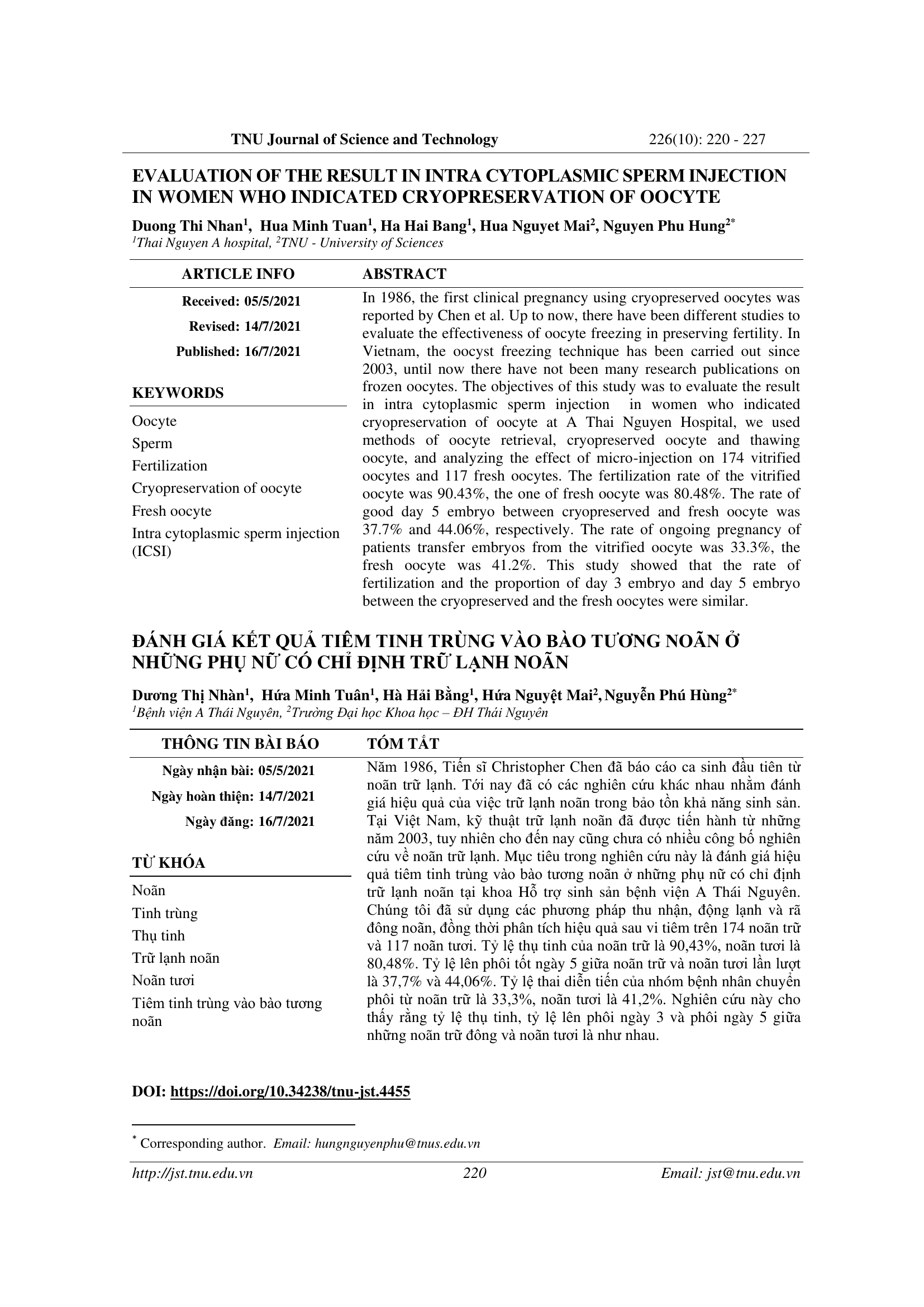 Năm 1986, Tiến sĩ Christopher Chen đã báo cáo ca sinh đầu tiên từ noãn trữ lạnh. Tới nay đã có các nghiên cứu khác nhau nhằm đánh giá hiệu quả của việc trữ lạnh noãn trong bảo tồn khả năng sinh sản. Tại Việt Nam, kỹ thuật trữ lạnh noãn đã được tiến hành từ những năm 2003, tuy nhiên cho đến nay cũng chưa có nhiều công bố nghiên cứu về noãn trữ lạnh. Mục tiêu trong nghiên cứu này là đánh giá hiệu quả tiêm tinh trùng vào bào tương noãn ở những phụ nữ có chỉ định trữ lạnh noãn tại khoa Hỗ trợ sinh sản bệnh viện A Thái Nguyên. Chúng tôi đã sử dụng các phương pháp thu nhận, động lạnh và rã đông noãn, đồng thời phân tích hiệu quả sau vi tiêm trên 174 noãn trữ và 117 noãn tươi. Tỷ lệ thụ tinh của noãn trữ là 90,43%, noãn tươi là 80,48%. Tỷ lệ lên phôi tốt ngày 5 giữa noãn trữ và noãn tươi lần lượt là 37,7% và 44,06%. Tỷ lệ thai diễn tiến của nhóm bệnh nhân chuyển phôi từ noãn trữ là 33,3%, noãn tươi là 41,2%. Nghiên cứu này cho thấy rằng tỷ lệ thụ tinh, tỷ lệ lên phôi ngày 3 và phôi ngày 5 giữa những noãn trữ đông và noãn tươi là như nhau.