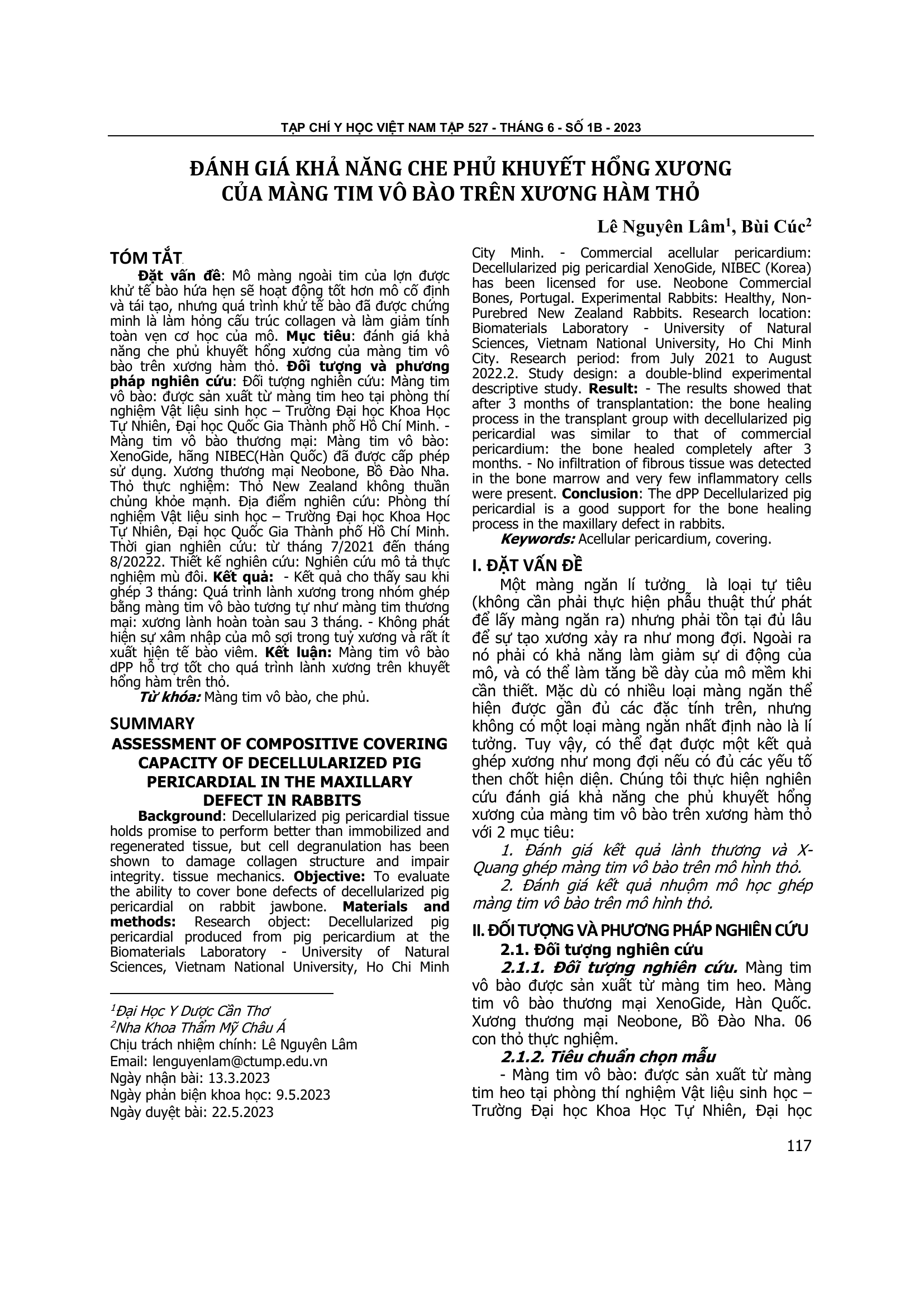 Đánh giá khả năng che phủ khuyết hổng xương của màng tim vô bào trên xương hàm thỏ. Đối tượng và phương pháp nghiên cứu: Đối tượng nghiên cứu: Màng tim vô bào: được sản xuất từ màng tim heo tại phòng thí nghiệm Vật liệu sinh học – Trường Đại học Khoa Học Tự Nhiên, Đại học Quốc Gia Thành phố Hồ Chí Minh. - Màng tim vô bào thương mại: Màng tim vô bào: XenoGide, hãng NIBEC(Hàn Quốc) đã được cấp phép sử dụng. Xương thương mại Neobone, Bồ Đào Nha. Thỏ thực nghiệm: Thỏ New Zealand không thuần chủng khỏe mạnh. Địa điểm nghiên cứu: Phòng thí nghiệm Vật liệu sinh học – Trường Đại học Khoa Học Tự Nhiên, Đại học Quốc Gia Thành phố Hồ Chí Minh. Thời gian nghiên cứu: từ tháng 7/2021 đến tháng 8/20222. Thiết kế nghiên cứu: Nghiên cứu mô tả thực nghiệm mù đôi. Kết quả: - Kết quả cho thấy sau khi ghép 3 tháng: Quá trình lành xương trong nhóm ghép bằng màng tim vô bào tương tự như màng tim thương mại: xương lành hoàn toàn sau 3 tháng. - Không phát hiện sự xâm nhập của mô sợi trong tuỷ xương và rất ít xuất hiện tế bào viêm. Kết luận: Màng tim vô bào dPP hỗ trợ tốt cho quá trình lành xương trên khuyết hổng hàm trên thỏ.