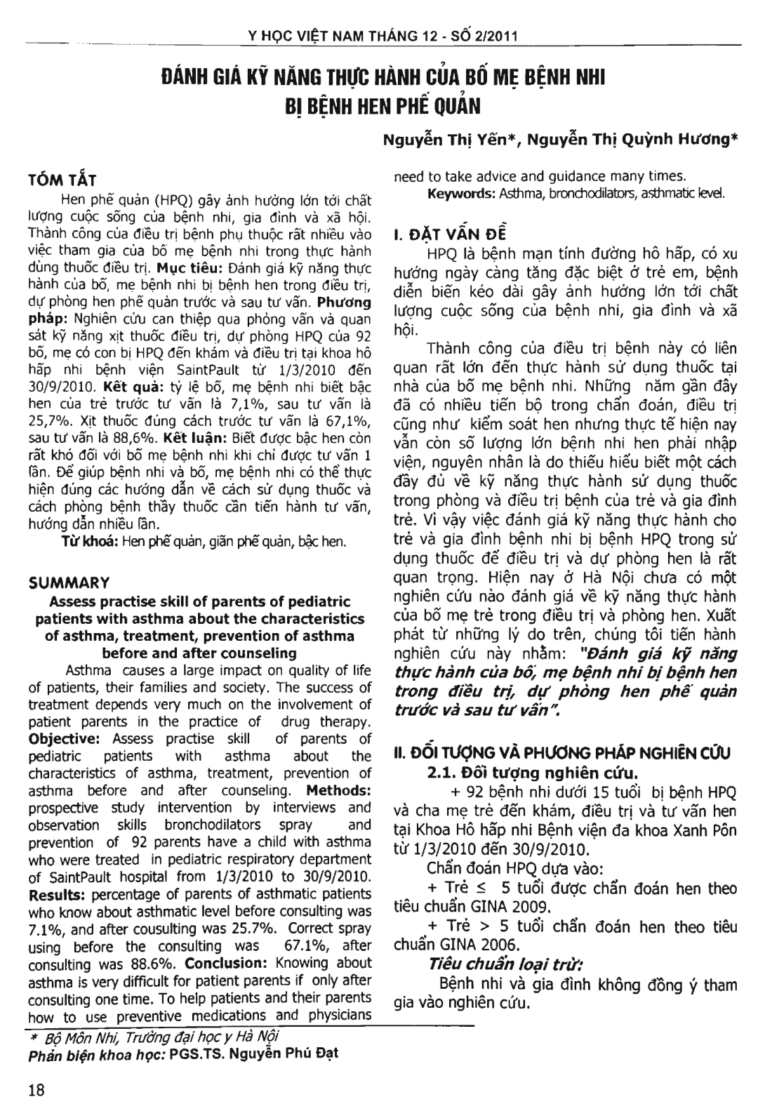 Asthma causes a large impact on quality of life of patients, their families and society. The success of treatment depends very much on the involvement of patient parents in the practice of drug therapy. Objective: Assess practise skill of parents of pediatric patients with asthma about the characteristics of asthma, treatment, prevention of asthma before and after counseling. Methods: prospective study intervention by interviews and observation skills bronchodilators spray and prevention of 92 parents have a child with asthma who were treated in pediatric respiratory department of SaintPault hospital from 1/3/2010 to 30/9/2010. Results: percentage of parents of asthmatic patients who know about asthmatic level before consulting was 7.1 percent, and after cousulting was 25.7 percent. Correct spray using before the consulting was 67.1 percent, after consulting was 88.6 percent. Conclusion: Knowing about asthma is very difficult for patient parents if only after consulting one time. To help patients and their parents how to use preventive medications and physicians need to take advice and guidance many times.
