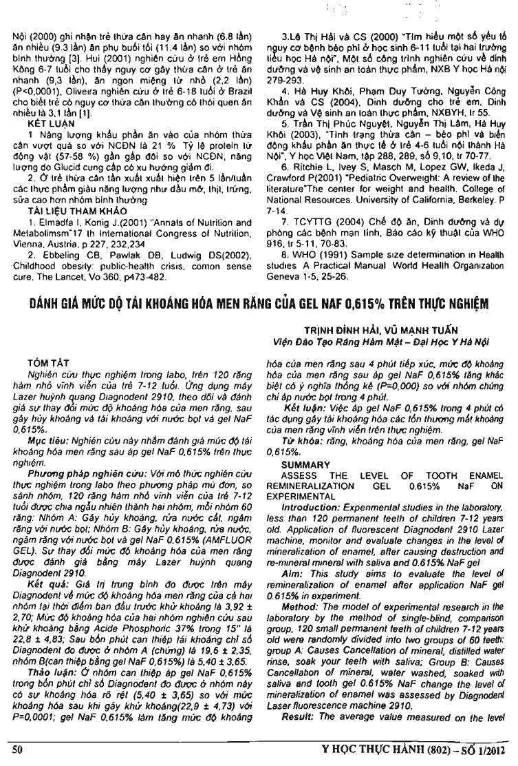 Introduction: Experimental studies in the laboratory, less than 120 permanent teeth of children 7-12 years old. Application of fluorescent Diagnodent 2910 Lazer machine, monitor and evaluate changes in the level of mineralization of enamel, after causing destruction and re-mineral mineral with saliva and 0.615 percent NaF gel. Aim: This study aims to evaluate the level of remineralization of enamel after application NaF gel 0.615 percent in experiment. Method: The model of experimental research in the laboratory by the method of single-blind, comparison group, 120 small permanent teeth of children 7-12 years old were randomly divided into two groups of 60 teeth: group A: Causes Cancellation of mineral, distilled water rinse, soak your teeth with saliva; Group B: Causes Cancellation of mineral, water washed, soaked with saliva and tooth gel 0.615 percent NaF change the level of mineralization of enamel was assessed by Diagnodent Laserfluorescence machine 2910. Result: The average value measured on the level Diagnodent enamel mineralization of both groups at the beginning before demineralization was 3.92 + or - 2.70; degree of mineralization of the two groups after Phosphoric acid, demineralized with 37 percent in the 15" was 22.8 + or - 4.83; After four minutes re-mineral intervention Diagnodent index measured in group A (control) was 19.6 + or - 2.35, group B (interference with 0.615 percent NaF gel) was 5.40 + or - 3.65. Discussion: In the intervention group pressure 0.615 percent NaF gel for four minutes Diagnodent index measured in this group have significant mineralization (5.40 + or - 3.65) compared with mineralized after causing demineralization (22.9 + or - 4.73) with P = 0.0001; gel 0.615 percent NaF increased the level of mineralization of enamel after 4 minutes of exposure, degree of mineralization of enamel after 0. 615 percent NaF gel increased pressure difference statistically significant (P = 0.0001) compared with controls only in the 4-minute saliva Conclusion: The application of 0.615 percent NaF gel for 4 minutes is the remineralization effect of causing lesions of enamel mineral lost forever in experiment.