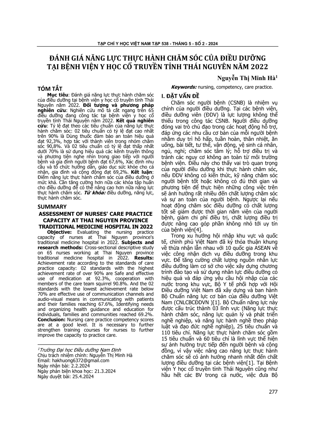 Evaluating the nursing practice capacity of nurses at Thai Nguyen province's traditional medicine hospital in 2022. Subjects and research methods: Cross-sectional descriptive study on 65 nurses working at Thai Nguyen province traditional medicine hospital in 2022. Results: Achievement rate according to the standards of care practice capacity: 02 standards with the highest achievement rate of over 90% are Safe and effective use of medication at 92.3%, cooperation with members of the care team squirrel 90.8%. And the 02 standards with the lowest achievement rate below 70% are effective use of communication channels and audio-visual means in communicating with patients and their families reaching 67.6%, Identifying needs and organizing health guidance and education for individuals, families and communities reached 69.2%. Conclusion: Nursing care practice competency scores are at a good level. It is necessary to further strengthen training courses for nurses to further improve the capacity to practice care.