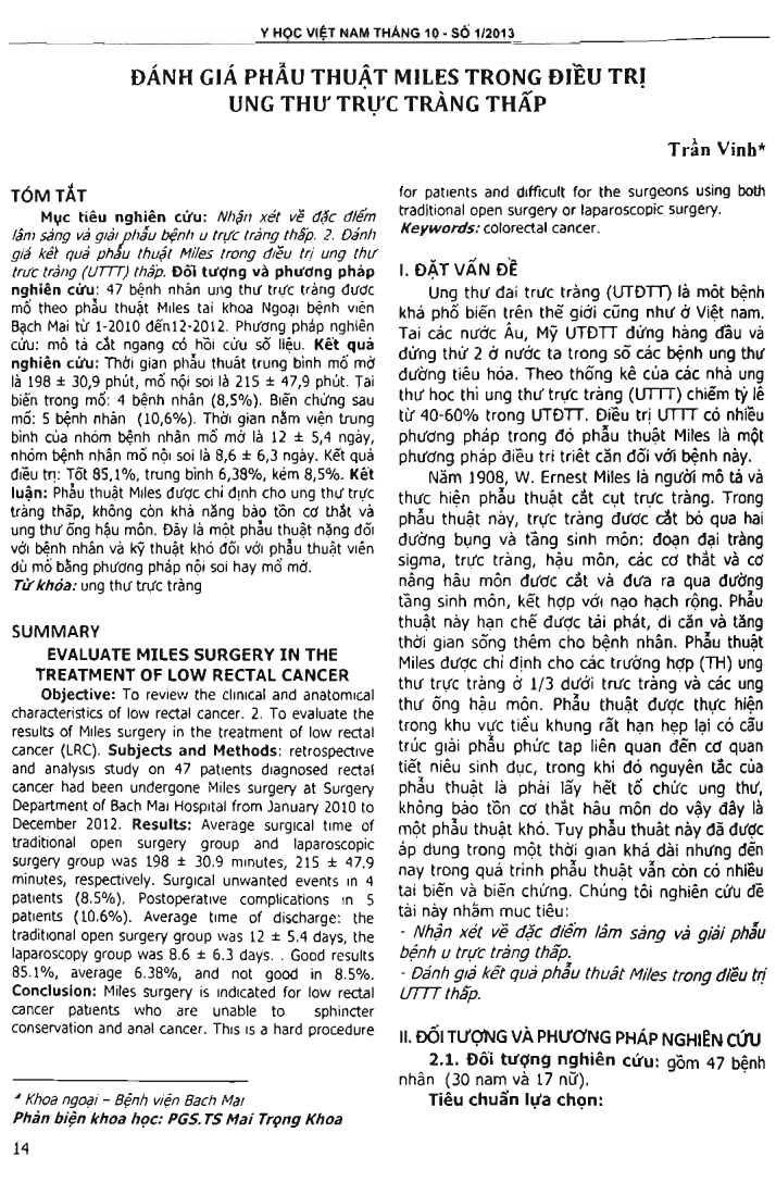 Objective: To review the clinical and anatomical characteristics of low rectal cancer. To evaluate the results of Miles surgery in the treatment of low rectal cancer (LRC). Subjects and Methods: retrospective and analysis study on 47 patients diagnosed rectal cancer had been undergone Miles surgery at Surgery Department of Bach Mai Hospital from January 2010 to December 2012. Results: Average surgical time of traditional open surgery group and laparoscopic surgery group was 198 + or - 30.9 minutes, 215 + or - 47.9 minutes, respectively. Surgical unwanted events in 4 patients (8.5 percent). Postoperative complications in 5 patients (10.6 percent). Average time of discharge: the traditional open surgery group was 12 + or - 5.4 days, the laparoscopy group was 8.6 + or - 6.3 days. . Good results 85.1 percent, average 6.38 percent, and not good in 8.5 percent. Conclusion: Miles surgery is indicated for low rectal cancer patients who are unable to sphincter conservation and anal cancer. This is a hard procedure for patients and difficult for the surgeons using both traditional open surgery or laparoscopic surgery.