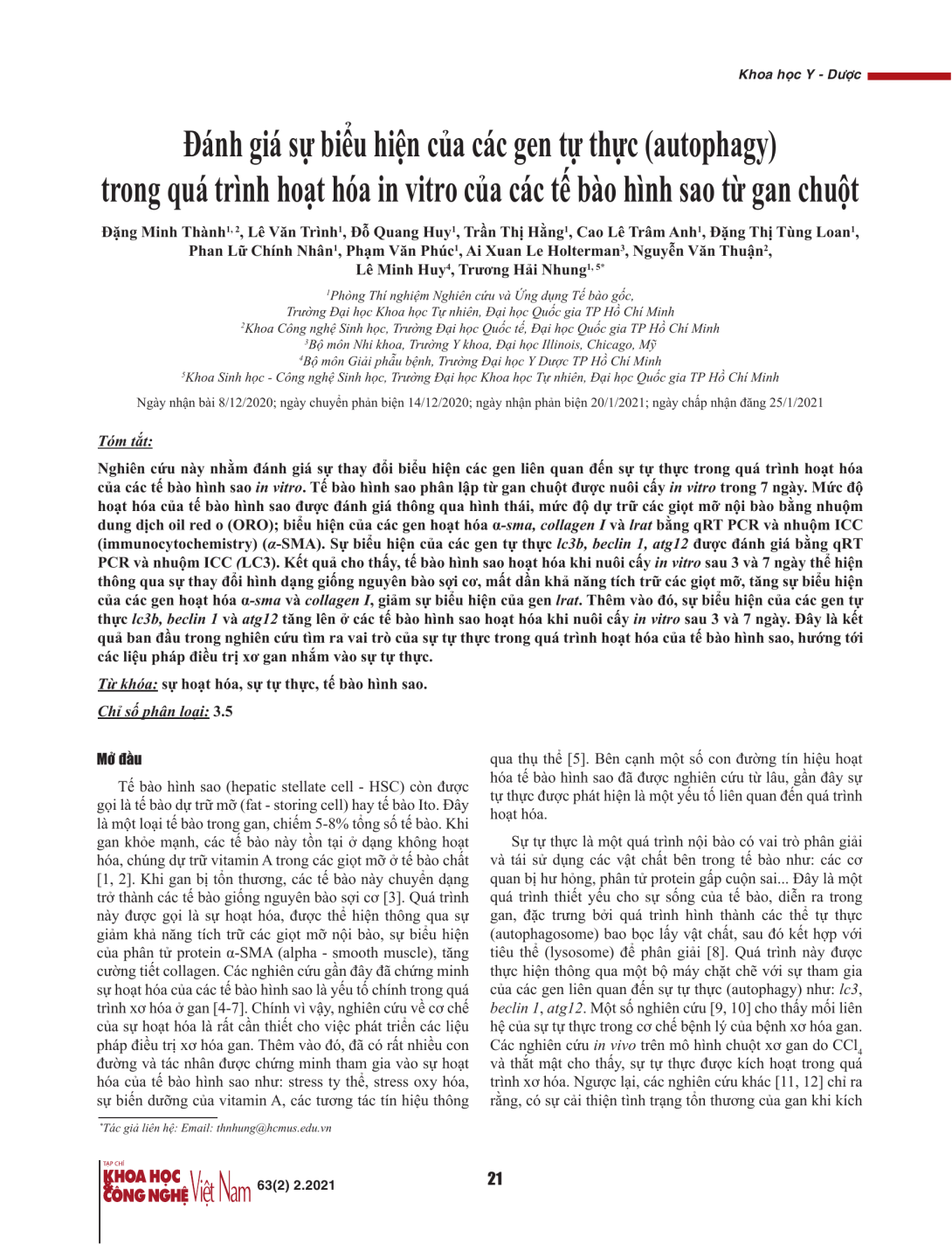 Nghiên cứu này nhằm đánh giá sự thay đổi biểu hiện các gen liên quan đến sự tự thực trong quá trình hoạt hóa của các tế bào hình sao in vitro. Tế bào hình sao phân lập từ gan chuột được nuôi cấy in vitro trong 7 ngày. Mức độ hoạt hóa của tế bào hình sao được đánh giá thông qua hình thái, mức độ dự trữ các giọt mỡ nội bào bằng nhuộm dung dịch oil red o (ORO); biểu hiện của các gen hoạt hóa α-sma, collagen I và lrat bằng qRT PCR và nhuộm ICC (immunocytochemistry) (α-SMA). Sự biểu hiện của các gen tự thực lc3b, beclin 1, atg12 được đánh giá bằng qRT PCR và nhuộm ICC (LC3). Kết quả cho thấy, tế bào hình sao hoạt hóa khi nuôi cấy in vitro sau 3 và 7 ngày thể hiện thông qua sự thay đổi hình dạng giống nguyên bào sợi cơ, mất dần khả năng tích trữ các giọt mỡ, tăng sự biểu hiện của các gen hoạt hóa α-sma và collagen I, giảm sự biểu hiện của gen lrat. Thêm vào đó, sự biểu hiện của các gen tự thực lc3b, beclin 1 và atg12 tăng lên ở các tế bào hình sao hoạt hóa khi nuôi cấy in vitro sau 3 và 7 ngày. Đây là kết quả ban đầu trong nghiên cứu tìm ra vai trò của sự tự thực trong quá trình hoạt hóa của tế bào hình sao, hướng tới các liệu pháp điều trị xơ gan nhắm vào sự tự thực.