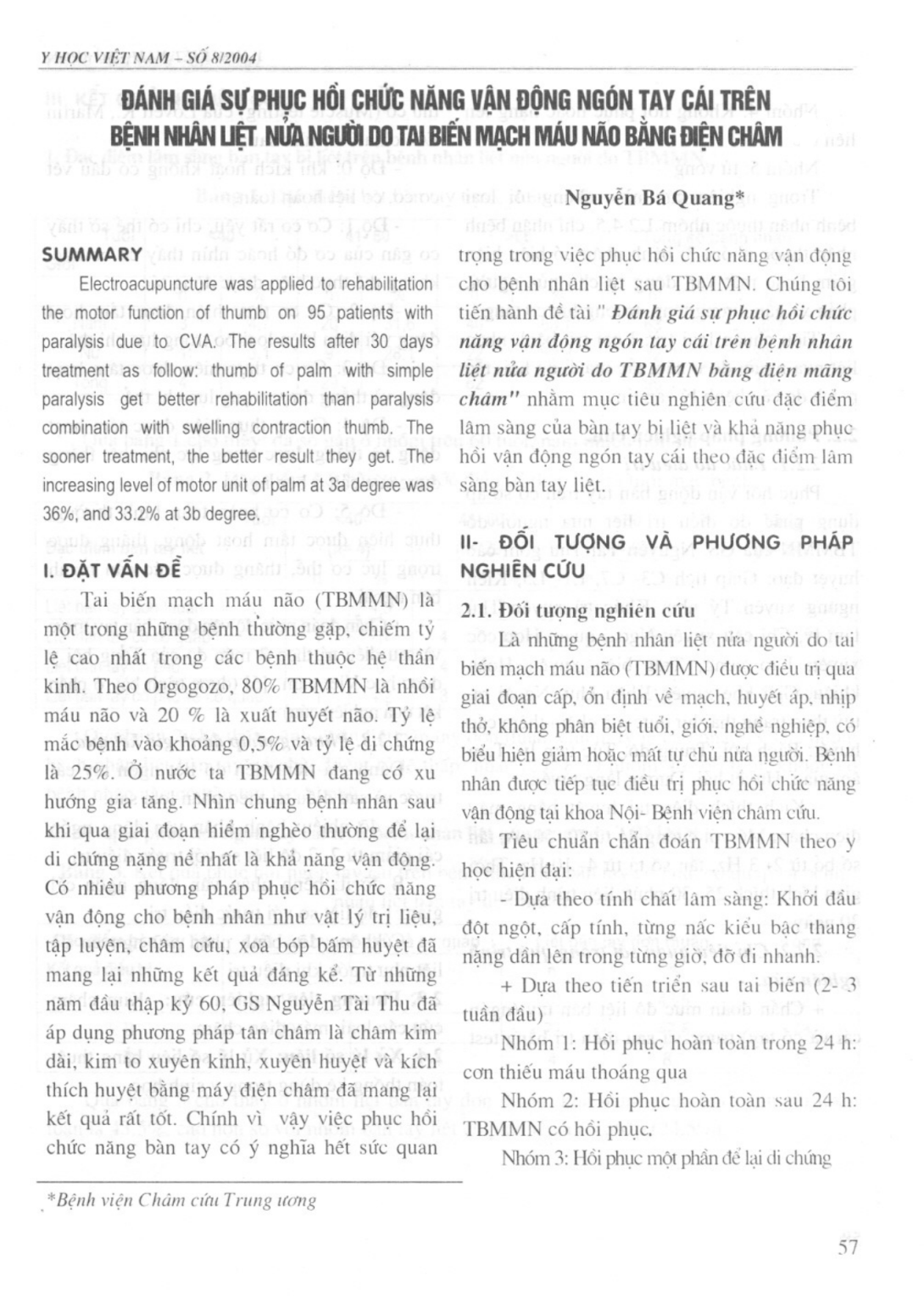 Đánh giá sự phục hồi chức năng vận động ngón tay cái trên bệnh nhân liệt nửa người do tai biến mạch máu não bằng điện châm