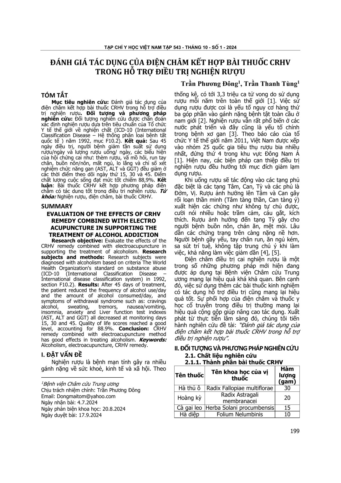 Evaluate the effects of the CRHV remedy combined with electroacupuncture in supporting the treatment of alcoholism. Research subjects and methods: Research subjects were diagnosed with alcoholism based on criteria The World Health Organization's standard on substance abuse (ICD-10 (International Classification Disease – International disease classification system) in 1992, section F10.2). Results: After 45 days of treatment, the patient reduced the frequency of alcohol use/day and the amount of alcohol consumed/day, and symptoms of withdrawal syndrome such as: cravings alcohol, sweating, tremors, nausea/vomiting, insomnia, anxiety and Liver function test indexes (AST, ALT and GGT) all decreased at monitoring days 15, 30 and 45. Quality of life scores reached a good level, accounting for 88.9%. Conclusion: CRHV remedy combined with electroacupuncture method has good effects in treating alcoholism.