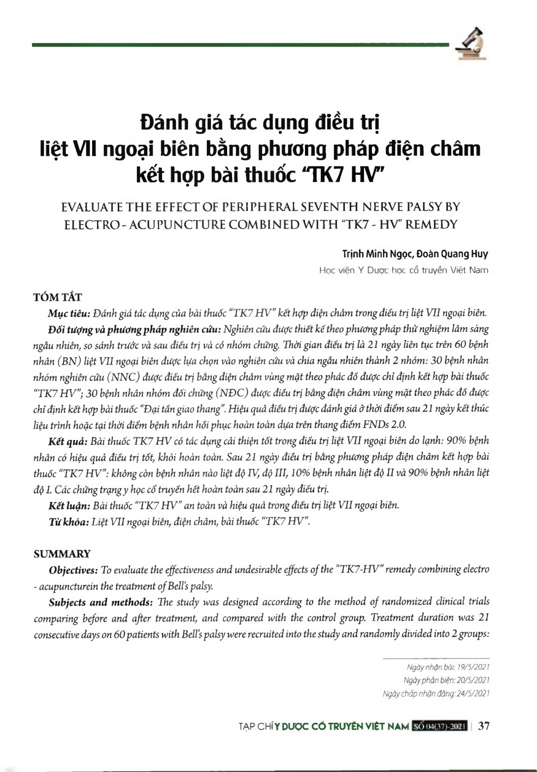 Nghiên cứu được thiết kế theo phương pháp thử nghiệm lâm sàng ngẫu nhiên, so sánh trước và sau điều trị và có nhóm chứng. Thời gian điều trị là 21 ngày liên tục trên 60 bệnh nhân (BN) liệt VII ngoại biên được lựa chọn vào nghiên cứu và chia ngẫu nhiên thành 2 nhóm: 30 bệnh nhân nhóm nghiên cứu (NNC) được điều trị bằng điện châm vùng mặt theo phác đồ được chỉ định kết hợp bài thuốc “TK7 HV”; 30 bệnh nhân nhóm đối chứng (NĐC) được điều trị bằng điện châm vùng mặt theo phác đổ được chỉ định kết hợp bài thuốc "Đại tẩn giao thang”. Hiệu quả điều trị được đánh giá ở thời điềm sau 21 ngày kết thúc liệu trình hoặc tại thời điểm bệnh nhân hồi phục hoàn toàn dựa trên thang điểm FNDs 2.0.