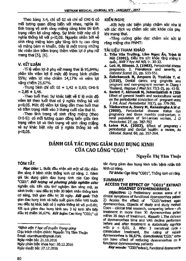 So sánh trước và sau điều trị trên 30 bệnh nhân thống kinh cơ năng được điều trị bằng cao lỏng CG01. Thời gian đau bụng kinh và hiệu suất giảm điểm VAS trước và sau điều trị có sự khác biệt. Giảm đau bụng kinh sau 3 kỳ kinh liên tiếp điều trị chiếm 96,67 phần trăm cho thấy cao lỏng CG01 có tác dụng giảm đau bụng kinh tên bệnh nhân thống kinh cơ năng.