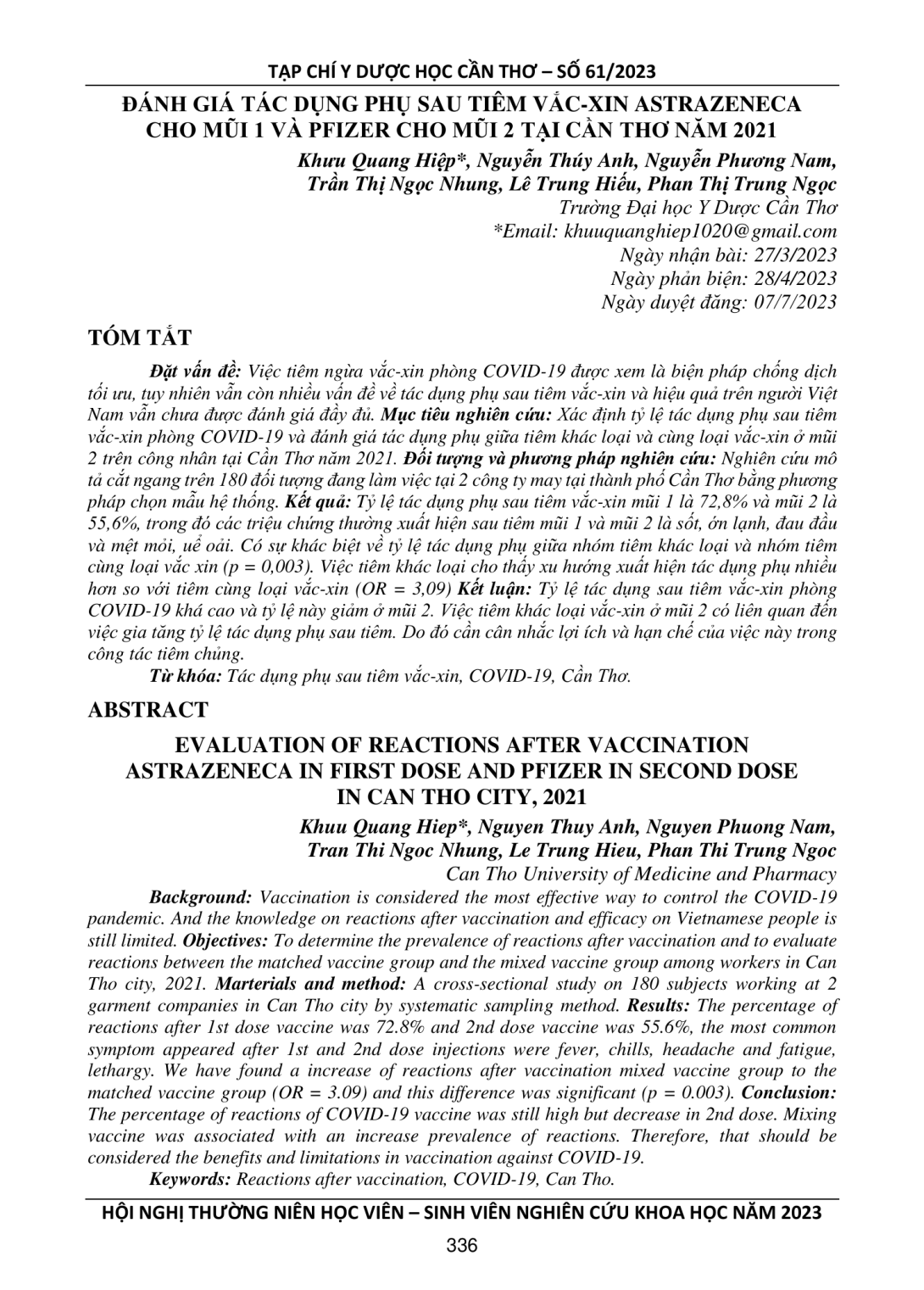 Xác định tỷ lệ tác dụng phụ sau tiêm vắc-xin phòng COVID-19 và đánh giá tác dụng phụ giữa tiêm khác loại và cùng loại vắc-xin ở mũi 2 trên công nhân tại Cần Thơ năm 2021. Đối tượng và phương pháp nghiên cứu: Nghiên cứu mô tả cắt ngang trên 180 đối tượng đang làm việc tại 2 công ty may tại thành phố Cần Thơ bằng phương pháp chọn mẫu hệ thống. Kết quả: Tỷ lệ tác dụng phụ sau tiêm vắc-xin mũi 1 là 72,8% và mũi 2 là 55,6%, trong đó các triệu chứng thường xuất hiện sau tiêm mũi 1 và mũi 2 là sốt, ớn lạnh, đau đầu và mệt mỏi, uể oải. Có sự khác biệt về tỷ lệ tác dụng phụ giữa nhóm tiêm khác loại và nhóm tiêm cùng loại vắc xin (p = 0,003). Việc tiêm khác loại cho thấy xu hướng xuất hiện tác dụng phụ nhiều hơn so với tiêm cùng loại vắc-xin (OR = 3,09) Kết luận: Tỷ lệ tác dụng sau tiêm vắc-xin phòng COVID-19 khá cao và tỷ lệ này giảm ở mũi 2. Việc tiêm khác loại vắc-xin ở mũi 2 có liên quan đến việc gia tăng tỷ lệ tác dụng phụ sau tiêm. Do đó cần cân nhắc lợi ích và hạn chế của việc này trong công tác tiêm chủng.