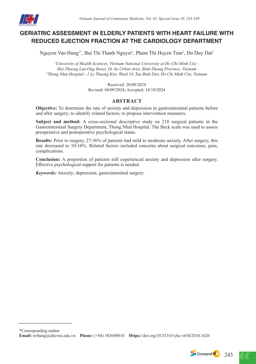 To determine the rate of anxiety and depression in gastrointestinal patients before and after surgery; to identify related factors; to propose intervention measures. Subject and method: A cross-sectional descriptive study on 218 surgical patients in the Gastrointestinal Surgery Department, Thong Nhat Hospital. The Beck scale was used to assess preoperative and postoperative psychological status. Results: Prior to surgery, 27-36% of patients had mild to moderate anxiety. After surgery, this rate decreased to 10-16%. Related factors included concerns about surgical outcomes, pain, complications. Conclusion: A proportion of patients still experienced anxiety and depression after surgery. Effective psychological support for patients is needed.