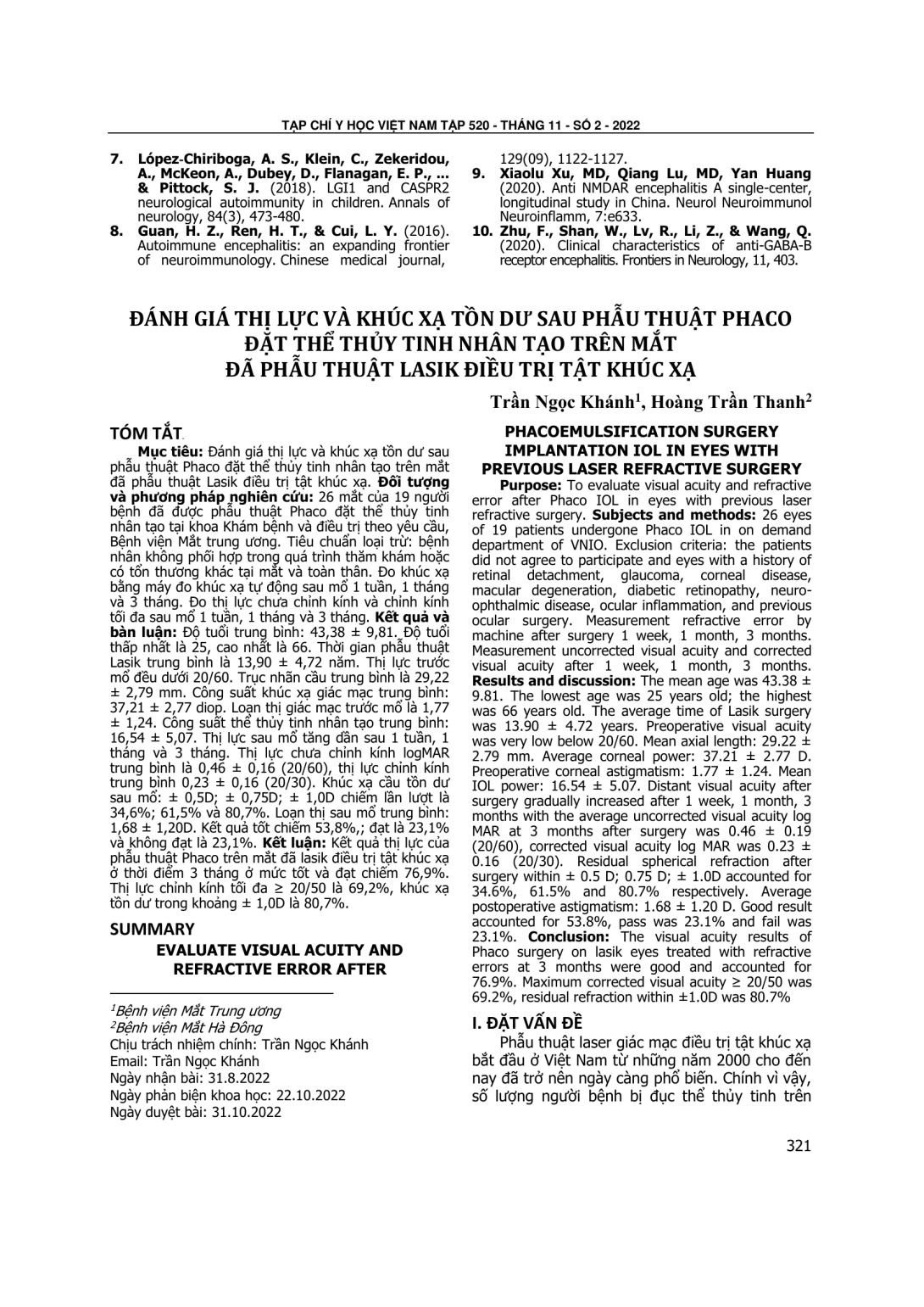 Đánh giá thị lực và khúc xạ tồn dư sau phẫu thuật Phaco đặt thể thủy tinh nhân tạo trên mắt đã phẫu thuật Lasik điều trị tật khúc xạ. Đối tượng và phương pháp nghiên cứu: 26 mắt của 19 người bệnh đã được phẫu thuật Phaco đặt thể thủy tinh nhân tạo tại khoa Khám bệnh và điều trị theo yêu cầu, Bệnh viện Mắt trung ương. Tiêu chuẩn loại trừ: bệnh nhân không phối hợp trong quá trình thăm khám hoặc có tổn thương khác tại mắt và toàn thân. Đo khúc xạ bằng máy đo khúc xạ tự động sau mổ 1 tuần, 1 tháng và 3 tháng. Đo thị lực chưa chỉnh kính và chỉnh kính tối đa sau mổ 1 tuần, 1 tháng và 3 tháng. Kết quả và bàn luận: Độ tuổi trung bình: 43,38 ± 9,81. Độ tuổi thấp nhất là 25, cao nhất là 66. Thời gian phẫu thuật Lasik trung bình là 13,90 ± 4,72 năm. Thị lực trước mổ đều dưới 20/60. Trục nhãn cầu trung bình là 29,22 ± 2,79 mm. Công suất khúc xạ giác mạc trung bình: 37,21 ± 2,77 diop. Loạn thị giác mạc trước mổ là 1,77 ± 1,24. Công suất thể thủy tinh nhân tạo trung bình: 16,54 ± 5,07. Thị lực sau mổ tăng dần sau 1 tuần, 1 tháng và 3 tháng. Thị lực chưa chỉnh kính logMAR trung bình là 0,46 ± 0,16 (20/60), thị lực chỉnh kính trung bình 0,23 ± 0,16 (20/30). Khúc xạ cầu tồn dư sau mổ: ± 0,5D; ± 0,75D; ± 1,0D chiếm lần lượt là 34,6%; 61,5% và 80,7%. Loạn thị sau mổ trung bình: 1,68 ± 1,20D. Kết quả tốt chiếm 53,8%,; đạt là 23,1% và không đạt là 23,1%. Kết luận: Kết quả thị lực của phẫu thuật Phaco trên mắt đã lasik điều trị tật khúc xạ ở thời điểm 3 tháng ở mức tốt và đạt chiếm 76,9%. Thị lực chỉnh kính tối đa ≥ 20/50 là 69,2%, khúc xạ tồn dư trong khoảng ± 1,0D là 80,7%.