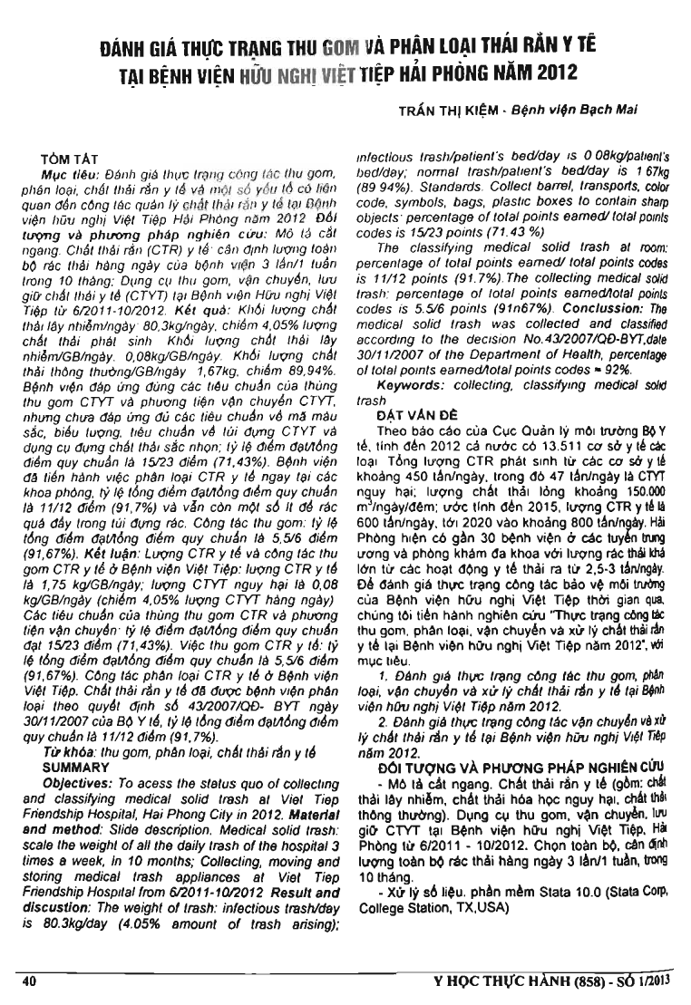 Objectives: To acess the status quo of collecting and classifying medical solid trash at Viet Tiep Friendship Hospital, Hai Phong city in 2012. Material and method: Slide description. Medical solid trash: scale the weight of all the daily trash of the hospital 3 times a week, in 10 months; Collecting, moving and storing medical trash appliances at Viet Tiep Friendship Hospital from 6/2011-10/2012. Result and discustion: The weight of trash: infectious trash/day is 80.3kg/day (4.05 percent amount of trash arising); infectious trash/patient's bed/day is 0.08kg/patient's bed/day; normal trash/patient's bed/day is 1.67kg (89.94 percent). Standards: Collect barrel, transports, color code, symbols, bags, plastic boxes to contain sharp objects: percentage of total points eamed/ total points codes is 15/23 points (71.43 percent). The classifying medical solid trash at room: percentage of total points eamed/ total points codes is 11/12 points (91.7 percent). The collecting medical solid trash: percentage of total points eamed/total points codes is 5.5/6 points (91.7 percent). Conclussion: The medical solid trash was collected and classified according to the decision No.43/2007/QfJ-BYT,date 30/11/2007 of the Department of Health, percentage of total points eamed/total points codes ~ 92 percent.