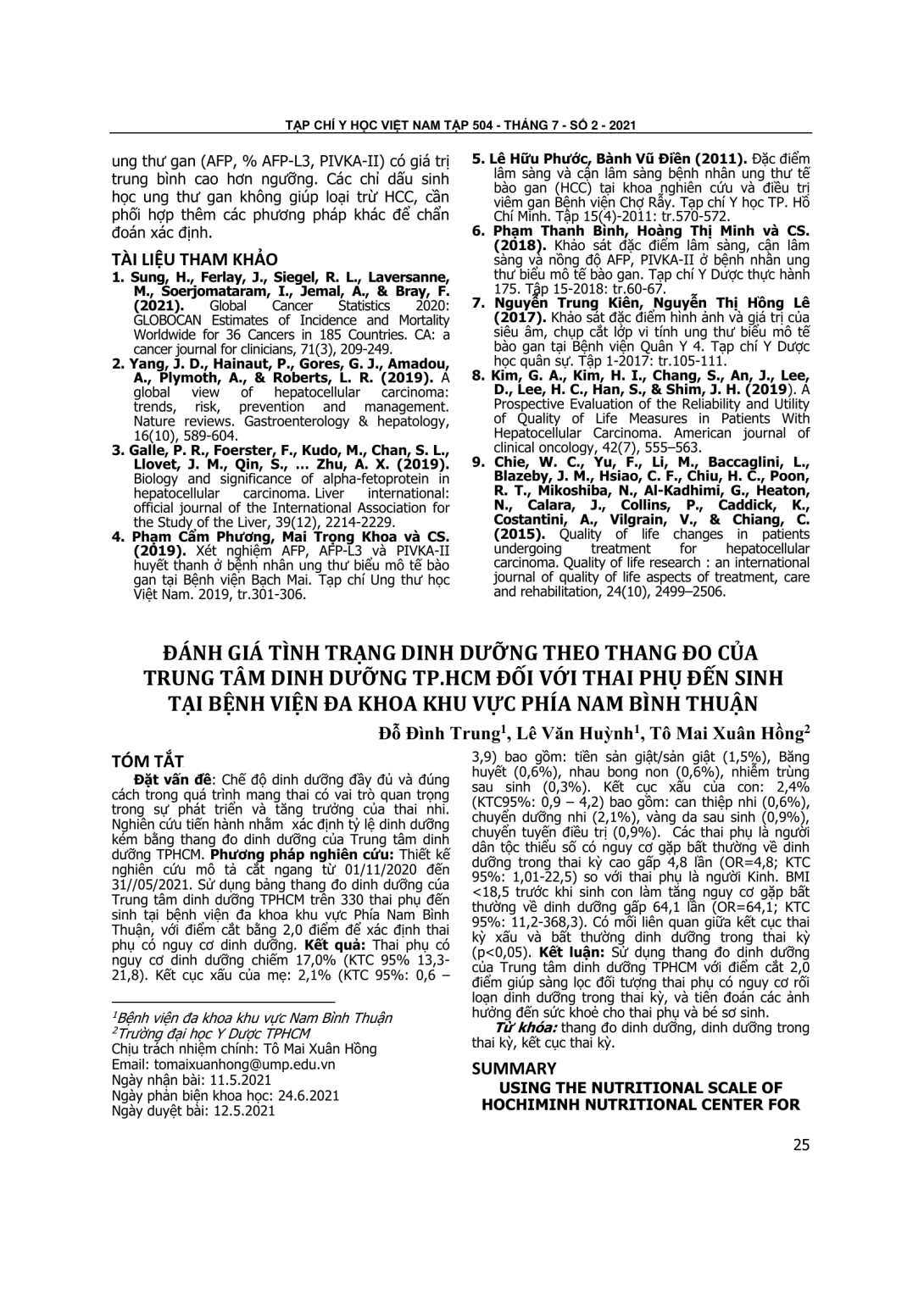 Chế độ dinh dưỡng đầy đủ và đúng cách trong quá trình mang thai có vai trò quan trọng trong sự phát triển và tăng trưởng của thai nhi. Nghiên cứu tiến hành nhằm xác định tỷ lệ dinh dưỡng kém bằng thang đo dinh dưỡng của Trung tâm dinh dưỡng TPHCM. Phương pháp nghiên cứu: Thiết kế nghiên cứu mô tả cắt ngang từ 01/11/2020 đến 31//05/2021. Sử dụng bảng thang đo dinh dưỡng cúa Trung tâm dinh dưỡng TPHCM trên 330 thai phụ đến sinh tại bệnh viện đa khoa khu vực Phía Nam Bình Thuận, với điểm cắt bằng 2,0 điểm để xác định thai phụ có nguy cơ dinh dưỡng. Kết quả: Thai phụ có nguy cơ dinh dưỡng chiếm 17,0% (KTC 95% 13,3- 21,8). Kết cục xấu của mẹ: 2,1% (KTC 95%: 0,6 –3,9) bao gồm: tiền sản giật/sản giật (1,5%), Băng huyết (0,6%), nhau bong non (0,6%), nhiễm trùng sau sinh (0,3%). Kết cục xấu của con: 2,4% (KTC95%: 0,9 – 4,2) bao gồm: can thiệp nhi (0,6%), chuyển dưỡng nhi (2,1%), vàng da sau sinh (0,9%), chuyển tuyến điều trị (0,9%). Các thai phụ là người dân tộc thiểu số có nguy cơ gặp bất thường về dinh dưỡng trong thai kỳ cao gấp 4,8 lần (OR=4,8; KTC 95%: 1,01-22,5) so với thai phụ là người Kinh. BMI <18,5 trước khi sinh con làm tăng nguy cơ gặp bất thường về dinh dưỡng gấp 64,1 lần (OR=64,1; KTC 95%: 11,2-368,3). Có mối liên quan giữa kết cục thai kỳ xấu và bất thường dinh dưỡng trong thai kỳ (p<0,05). Kết luận: Sử dụng thang đo dinh dưỡng của Trung tâm dinh dưỡng TPHCM với điểm cắt 2,0 điểm giúp sàng lọc đối tượng thai phụ có nguy cơ rối loạn dinh dưỡng trong thai kỳ, và tiên đoán các ảnh hưởng đến sức khoẻ cho thai phụ và bé sơ sinh