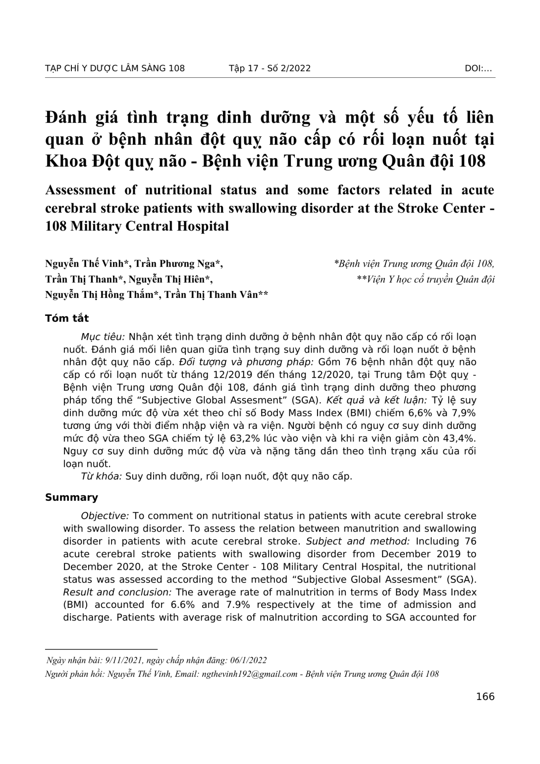 Nhận xét tình trạng dinh dưỡng ở bệnh nhân đột quỵ não cấp có rối loạn nuốt. Đánh giá mối liên quan giữa tình trạng suy dinh dưỡng và rối loạn nuốt ở bệnh nhân đột quỵ não cấp. Đối tượng và phương pháp: Gồm 76 bệnh nhân đột quỵ não cấp có rối loạn nuốt từ tháng 12/2019 đến tháng 12/2020, tại Trung tâm Đột quỵ - Bệnh viện Trung ương Quân đội 108, đánh giá tình trạng dinh dưỡng theo phương pháp tổng thể “Subjective Global Assesment” (SGA). Kết quả và kết luận: Tỷ lệ suy dinh dưỡng mức độ vừa xét theo chỉ số Body Mass Index (BMI) chiếm 6,6% và 7,9% tương ứng với thời điểm nhập viện và ra viện. Người bệnh có nguy cơ suy dinh dưỡng mức độ vừa theo SGA chiếm tỷ lệ 63,2% lúc vào viện và khi ra viện giảm còn 43,4%. Nguy cơ suy dinh dưỡng mức độ vừa và nặng tăng dần theo tình trạng xấu của rối loạn nuốt.