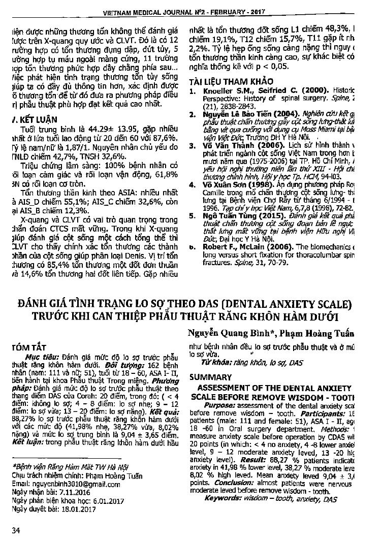 Đánh giá tình trạng lo sơ theo thang điểm DAS trước khi can thiệp phẫu thuật răng khôn hàm dưới trên 162 bệnh nhân tại bệnh viện Răng hàm mặt Trung ương. 88,72 phần trăm lo sợ trước phẫu thuật răng không hàm dưới với các mức độ nhẹ 41,98 phần trăm; vừa 38,27 phần trăm và nặng 8,02 phần trăm. Mức độ lo sợ trung bình là 9,04 cộng trừ 3,65 điểm.