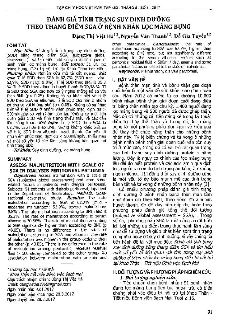 Đánh giá tình trạng suy dinh dưỡng theo thang điểm SGA trên 51 bệnh nhân lọc màng bụng. Kết quả cho thấy tỷ lệ suy dinh dưỡng theo SGA là 62,7 phần trăm, cao hơn theo BMI, nhưng không khác biệt so với tỷ lệ suy dinh dưỡng theo albumin huyết thanh. Các yếu tố như viêm phúc mạc, dịch dư, thiếu máu và một số yếu tố cận lâm sàng không liên quan tới tình trạng suy dinh dưỡng.