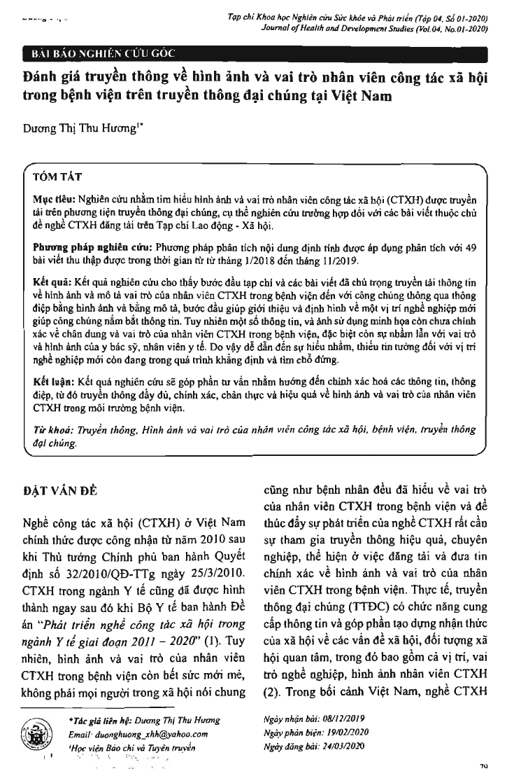 Nghiên cứu nhằm tìm hiểu hình ảnh và vai trò nhân viên công tác xã hội (CTXH) được truyền tải trên phương tiện truyền thông đại chúng, cụ thể nghiên cứu trường hợp đối với các bài viết thuộc chủ đề nghề CTXH đãng tải trên Tạp chí Lao động - Xã hội. Kết quả nghiên cứu cho thấy bước đầu tạp chí và các bài viết đã chú trọng truyền tải thông tin về hình ảnh và mô tả vai trò của nhân viên CTXH trong bệnh viện đến với công chúng thông qua thông điệp bằng hình ảnh và bằng mô tả, bước đầu giúp giới thiệu và định hình về một vị trí nghề nghiệp mới giúp công chúng nắm bắt thông tin. Tuy nhiên một số thông tin, và ảnh sử dụng minh họa còn chưa chính xác về chân dung và vai trò của nhân viên CTXH trong bệnh viện, đặc biệt còn sự nhầm lẫn với vai trò vả hình ảnh của y bác sỹ, nhân viên y tế. Do vậy dễ dẫn đến sự hiểu nhầm, thiếu tin tưởng đối với vị trí nghề nghiệp mới còn đang trong quá trình khẳng định và tìm chỗ đứng. Kết quả nghiên cứu sẽ góp phần tư vấn nhằm hướng đến chính xác hoá các thông tin, thông điệp, từ đó truyền thông đầy đủ, chính xác, chân thực và hiệu quả về hình ảnh vả vai trò của nhân viên CTXH trong môi trường bệnh viện.