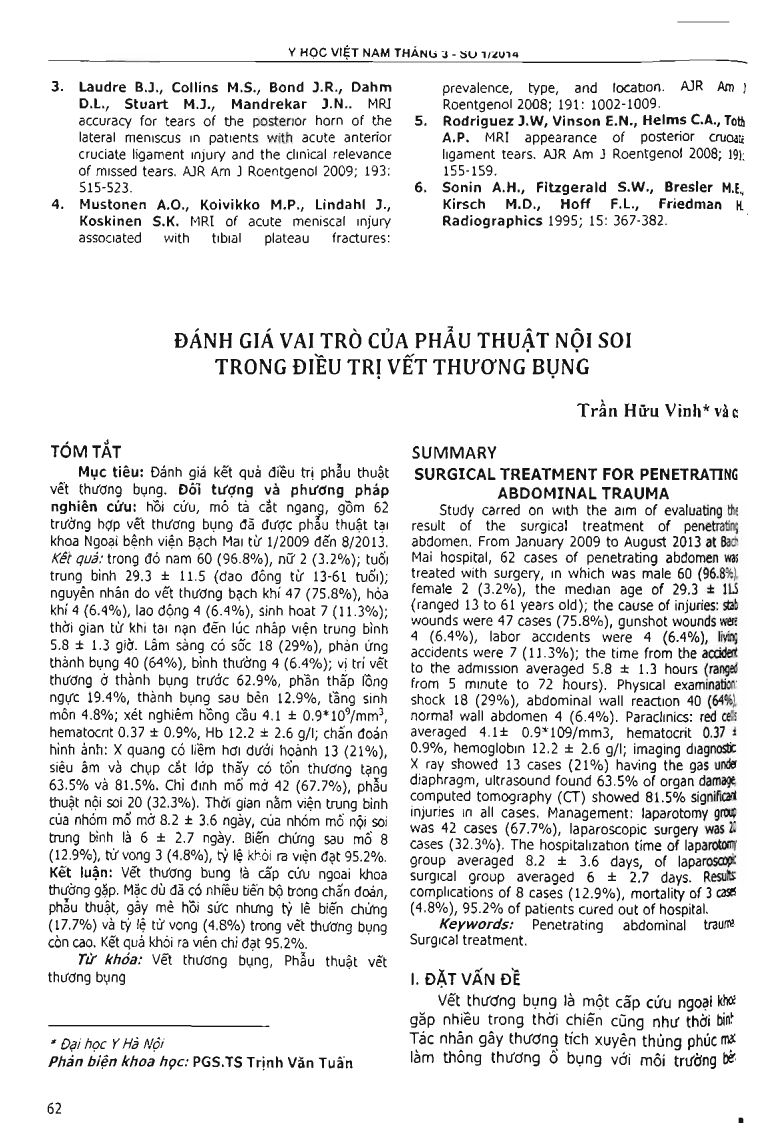 Study carred on with the aim of evaluating the result of the surgical treatment of penetrating abdomen. From January 2009 to August 2013 at Bach Mai hospital, 62 cases of penetrating abdomen was treated with surgery, in which was male 60 (96.8 percent), female 2 (3.2 percent), the median age of 29.3 + or - 11.5 (ranged 13 to 61 years old); the cause of injuries: stab wounds were 47 cases (75.8 percent), gunshot wounds were 4 (6.4 percent), labor accidents were 4 (6.4 percent), living accidents were 7 (11.3 percent); ~he time from the accident to the admission averaged 5~8 + or - 1.3 hours (ranged from 5 minute to 72 hours). Physical examination: shock 18 (29 percent), abdominal wall reaction 40 (64 percent), normal wall abdomen 4 (6.4 percent). Paraclinics: red cells averaged 4.1 + or - 0.9, 109/mm.3, hematocrit 0.37 + or -: 0.9 percent, hemoglobin 12.2 + or - 2.6 g/I; imaging diagnostic: X ray showed 13 cases (21 percent) having the gas under diaphragm, ultrasound found 63.5 percent of organ damage, computed tomography (CT) showed 81.5 percent significant injuries in all cases. Management: laparotomy group was 42 cases (67.7 percent), laparoscopic surgery was 20 cases (32.3 percent). The hospitalization time of laparotomy group averaged 8.2 + or - 3.6 days, of laparoscopic surgical group averaged 6 + or - 2.7 days. Results: complications of 8 cases (12.9 percent), mortality of 3 cases (4.8 percent), 95.2 percent of patients cured out of hospital.