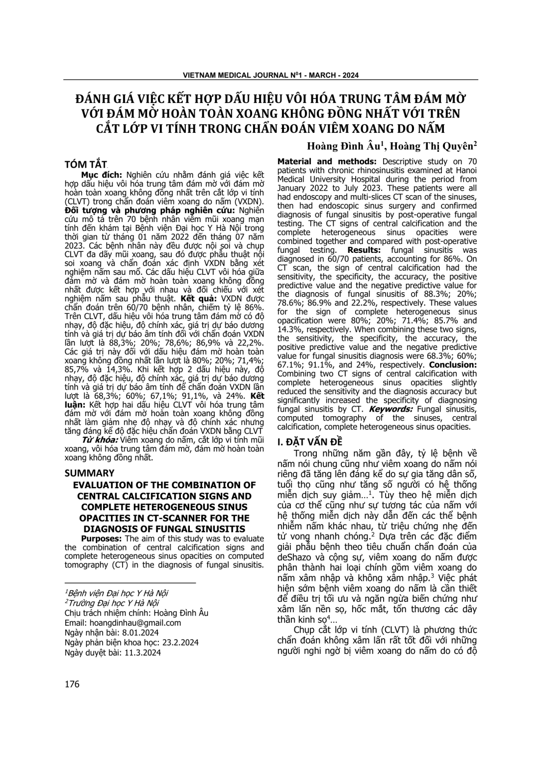 Nghiên cứu nhằm đánh giá việc kết hợp dấu hiệu vôi hóa trung tâm đám mờ với đám mờ hoàn toàn xoang không đồng nhất trên cắt lớp vi tính (CLVT) trong chẩn đoán viêm xoang do nấm (VXDN). Đối tượng và phương pháp nghiên cứu: Nghiên cứu mô tả trên 70 bệnh nhân viêm mũi xoang mạn tính đến khám tại Bệnh viện Đại học Y Hà Nội trong thời gian từ tháng 01 năm 2022 đến tháng 07 năm 2023. Các bệnh nhân này đều được nội soi và chụp CLVT đa dãy mũi xoang, sau đó được phẫu thuật nội soi xoang và chẩn đoán xác định VXDN bằng xét nghiệm nấm sau mổ. Các dấu hiệu CLVT vôi hóa giữa đám mờ và đám mờ hoàn toàn xoang không đồng nhất được kết hợp với nhau và đối chiếu với xét nghiệm nấm sau phẫu thuật. Kết quả: VXDN được chẩn đoán trên 60/70 bệnh nhân, chiếm tỷ lệ 86%. Trên CLVT, dấu hiệu vôi hóa trung tâm đám mờ có độ nhạy, độ đặc hiệu, độ chính xác, giá trị dự báo dương tính và giá trị dự báo âm tính đối với chẩn đoán VXDN lần lượt là 88,3%; 20%; 78,6%; 86,9% và 22,2%. Các giá trị này đối với dấu hiệu đám mờ hoàn toàn xoang không đồng nhất lần lượt là 80%; 20%; 71,4%; 85,7% và 14,3%. Khi kết hợp 2 dấu hiệu này, độ nhạy, độ đặc hiệu, độ chính xác, giá trị dự báo dương tính và giá trị dự báo âm tính để chẩn đoán VXDN lần lượt là 68,3%; 60%; 67,1%; 91,1%, và 24%. Kết luận: Kết hợp hai dấu hiệu CLVT vôi hóa trung tâm đám mờ với đám mờ hoàn toàn xoang không đồng nhất làm giảm nhẹ độ nhạy và độ chính xác nhưng tăng đáng kể độ đặc hiệu chẩn đoán VXDN bằng CLVT.