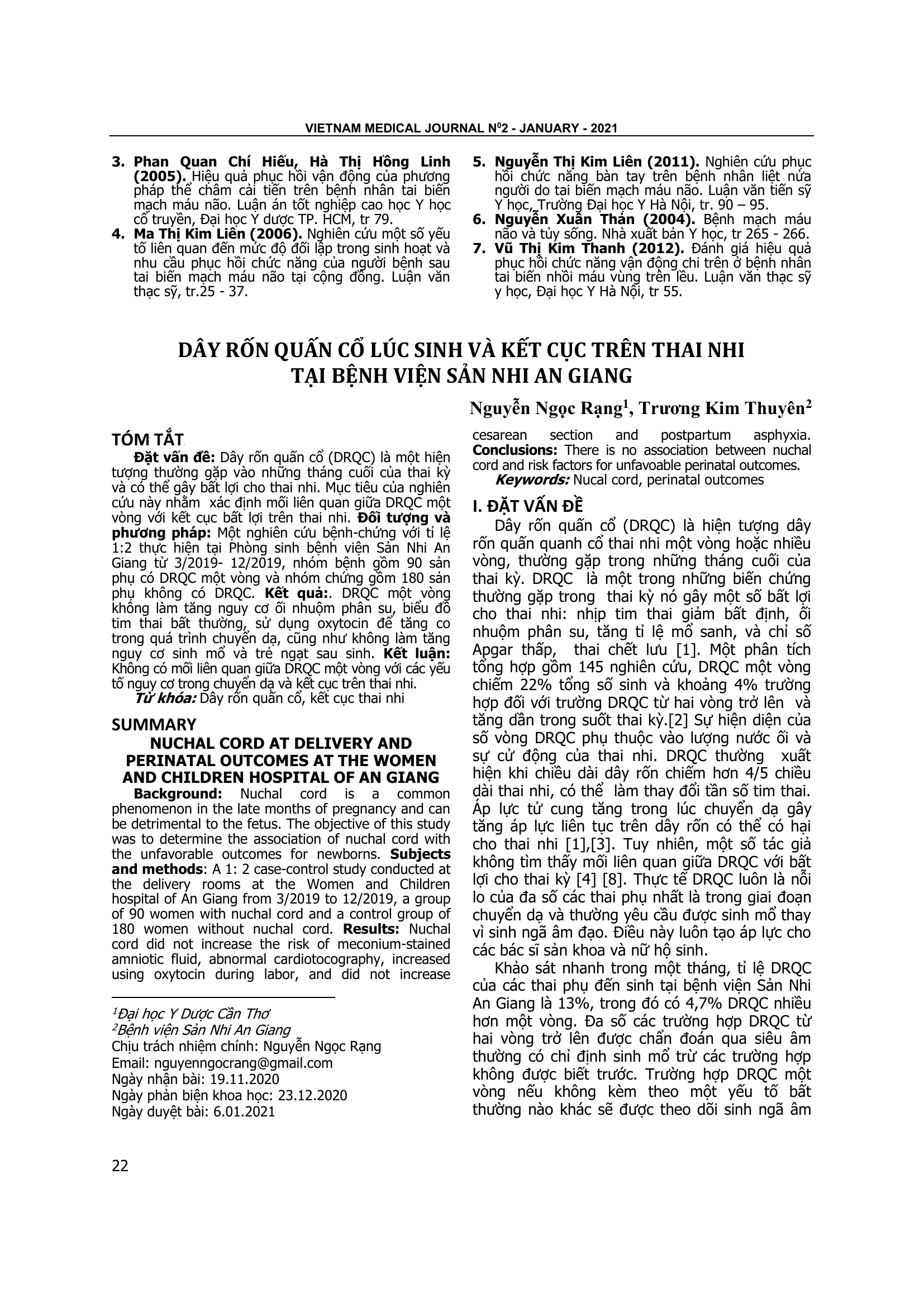 Nuchal cord is a common phenomenon in the late months of pregnancy and can be detrimental to the fetus. The objective of this study was to determine the association of nuchal cord with the unfavorable outcomes for newborns. Subjects and methods: A 1: 2 case-control study conducted at the delivery rooms at the Women and Children hospital of An Giang from 3/2019 to 12/2019, a group of 90 women with nuchal cord and a control group of 180 women without nuchal cord. Results: Nuchal cord did not increase the risk of meconium-stained amniotic fluid, abnormal cardiotocography, increased using oxytocin during labor, and did not increase cesarean section and postpartum asphyxia. Conclusions: There is no association between nuchal cord and risk factors for unfavoable perinatal outcomes.