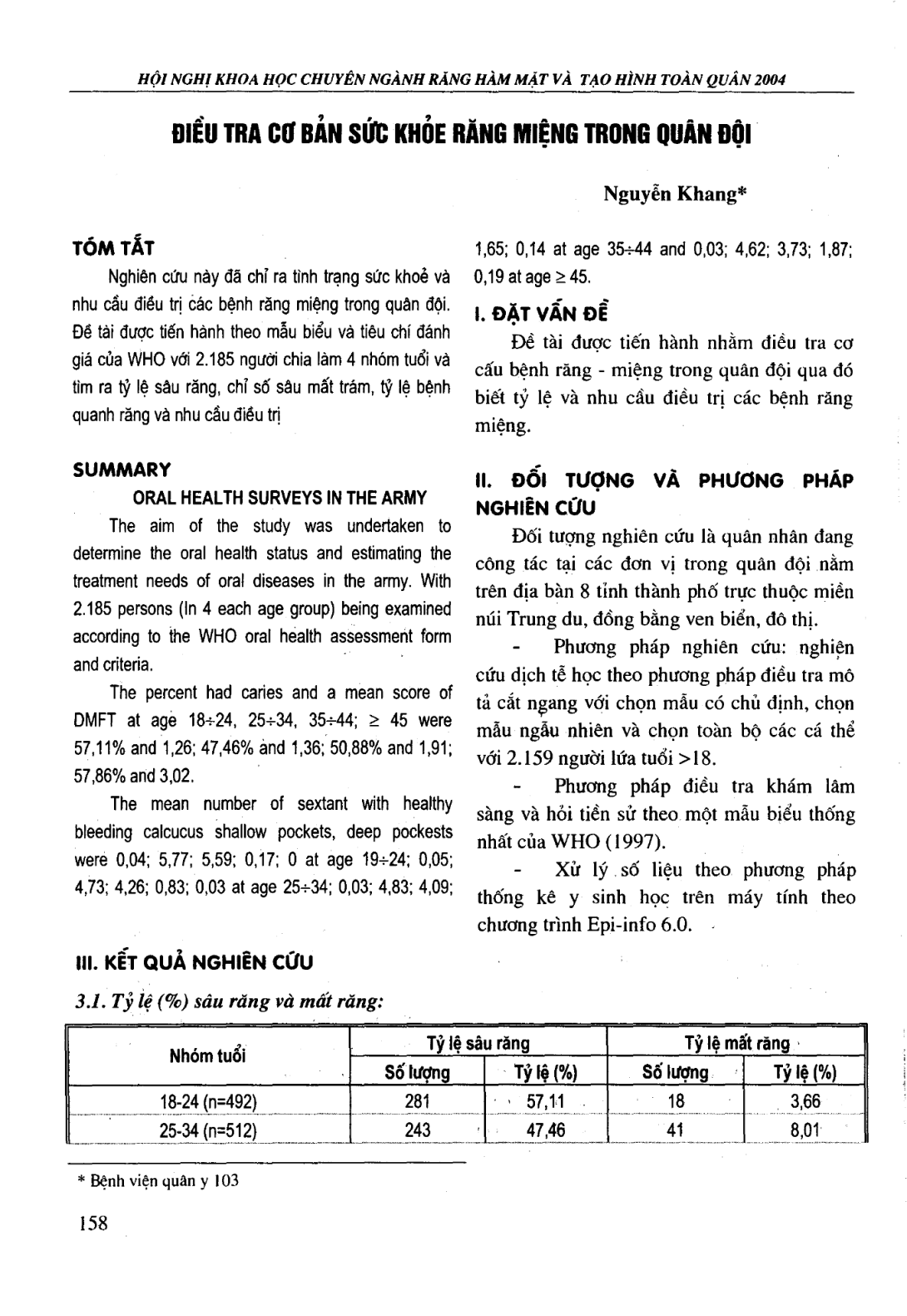 Trong cơ cấu bệnh răng miệng của bộ đội có hai loại bệnh chiếm tỷ lệ cao là sâu răng và bệnh quanh răng. Tỷ lệ sâu là 52,85% và 97,70% bộ đội mắc bệnh quanh răng, chủ yếu là vôi răng. Tuổi càng cao tình trạng của bệnh càng nặng và cao nhất ở lứa tuổi trên 45. Tỷ lệ mất răng là 12,6% và tăng dần theo tuổi, nhu cầu cần nhổ răng là 2,59% . Hầu hết bộ đội có niêm mạc miệng bình thường (99,72% ); có 20,94% người bị đục men và thiểu sản; tình trạng hư men răng do fluo chiếm tỷ lệ thấp 2,46% .