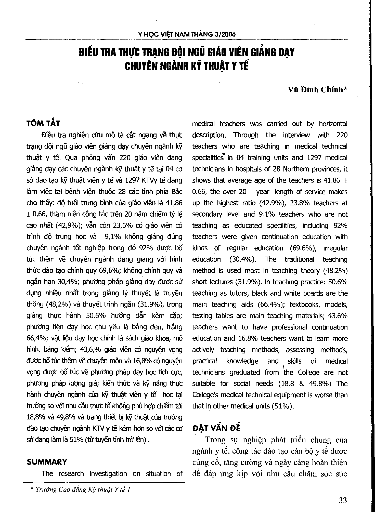 Điều tra nghiên cứu mô tả cắt ngang về thực trạng đội ngũ giáo viên giảng dạy chuyên ngành kỹ thuật y tế. Qua phỏng vấn 220 giáo viên đang giảng dạy các chuyên ngành kỹ thuật y tế tại 4 cơ sở đào tạo kỹ thuật viên y tế và 1297 KTV y tế đang làm việc tại bệnh viện thuộc 28 các tỉnh phía Bắc cho thấy: Độ tuổi trung bình của giáo viên là 41,86 # 0,66, thâm niên công tác trên 20 năm chiếm tỉ lệ cao nhất (42,9% ); vẫn còn 23,6% có giáo viên có trình độ trung học và 9,1% không giảng đúng chuyên ngành tốt nghiệp, trong đó 92% được bổ túc thêm về chuyên ngành đang giảng với hình thức đào tạo chính quy 69,6% ; không chính quy và ngắn hạn 30,4% ; 16,8% có nguyện vọng được bổ túc về phương pháp dạy học tích cực, phương pháp lượng giá; kiến thức và kỹ năng thực hành chuyên ngành của kỹ thuật viên y tế học tại trường so với nhu cầu thực tế không phù hợp chiếm tới 18,8% và 49,8% và trang thiết bị kỹ thuật của trường đào tạo chuyên ngành KTV y tế kém hơn so với các cơ sở đang làm là 51% ( từ tuyến tỉnh trở lên).