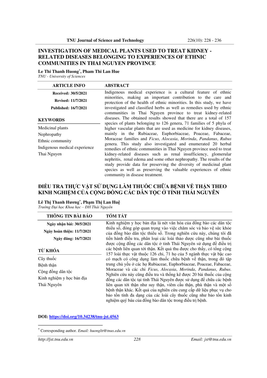 Kinh nghiệm y học bản địa là nét văn hóa của đồng bào các dân tộc thiểu số, đóng góp quan trọng vào việc chăm sóc và bảo vệ sức khỏe của đồng bào dân tộc thiểu số. Trong nghiên cứu này, chúng tôi đã tiến hành điều tra, phân loại các loài thảo dược cũng như bài thuốc được cộng đồng các dân tộc ở tỉnh Thái Nguyên sử dụng đề điều trị các bệnh liên quan tới thận. Kết quả thu được cho thấy, có tổng cộng 157 loài thực vật thuộc 126 chi, 71 họ của 5 ngành thực vật bậc cao có mạch có công dụng làm thuốc chữa bệnh về thận, trong đó tập trung chủ yếu ở các họ Rubiaceae, Euphorbiaceae, Poaceae, Fabaceae, Moraceae và các chi Ficus, Alocasia, Morinda, Pandanus, Rubus. Nghiên cứu này cũng điều tra và thống kê được 20 bài thuốc của cộng đồng các dân tộc tại tỉnh Thái Nguyên được sử dụng để chữa các bệnh liên quan tới thận như suy thận, viêm cầu thận, phù thận và một số bệnh thận khác. Kết quả của nghiên cứu cung cấp dữ liệu phục vụ cho bảo tồn tính đa dạng của các loài cây thuốc cũng như bảo tồn kinh nghiệm quý báu của đồng bào dân tộc trong điều trị bệnh