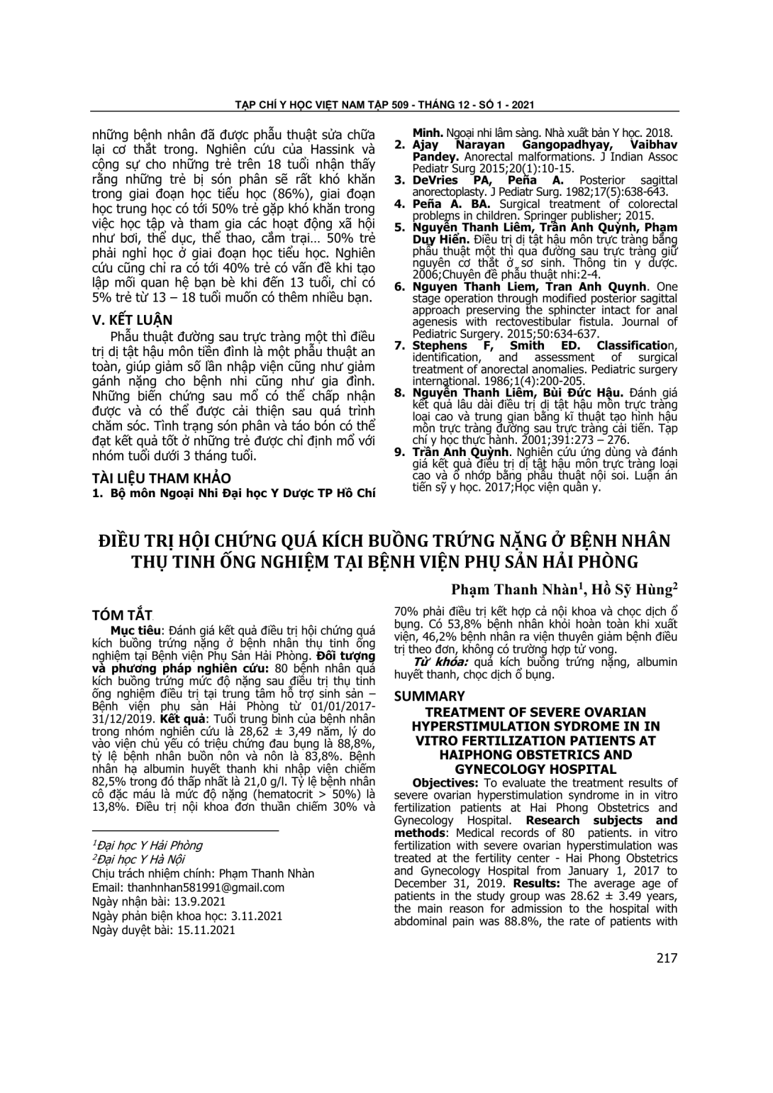 To evaluate the treatment results of severe ovarian hyperstimulation syndrome in in vitro fertilization patients at Hai Phong Obstetrics and Gynecology Hospital. Research subjects and methods: Medical records of 80 patients. in vitro fertilization with severe ovarian hyperstimulation was treated at the fertility center - Hai Phong Obstetrics and Gynecology Hospital from January 1, 2017 to December 31, 2019. Results: The average age of patients in the study group was 28.62 ± 3.49 years, the main reason for admission to the hospital with abdominal pain was 88.8%, the rate of patients with nausea and vomiting was 83. ,8%. Patients with hypoalbuminemia on admission accounted for 82.5% of which the lowest was 21.0 g/l. The proportion of patients with hemoconcentration as severe (hematocrit > 50%) was 13.8%. Medical treatment alone accounted for 30% and 70% had to be treated in combination with both medical and peritoneal puncture. There were 53.8% of patients completely cured upon discharge, 46.2% of patients discharged from hospital were in remission for prescription treatment, and there were no deaths.