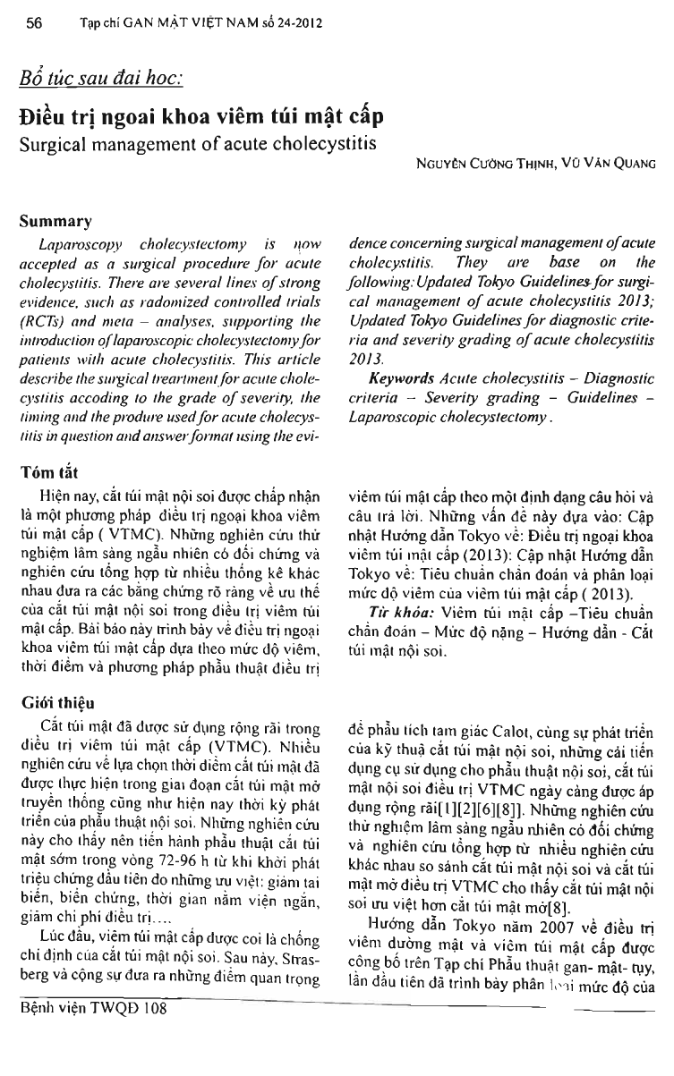 Laparoscopy cholecystectomy is now accepted as a surgical procedure for acute cholecystitis. There are several lines of strong evidence, such as radomized controlled trials (RCTs) and meta-analyses, supporting the introduction of laparoscopic cholecystectomy for patients with acute cholecystitis. This article describe the surgical treartment for acute cholecystitis accoding to the grade of severity, the timing and the produre used for acute cholecystitis in question and answer format using the evidence concerning surgical management of acute cholecystitis. They are base on the following: Updated Tokyo Guidelines for surgical management of acute cholecystitis 2013; Updated Tokyo Guidelines for diagnostic criteria and severity grading of acute cholecystitis 2013.