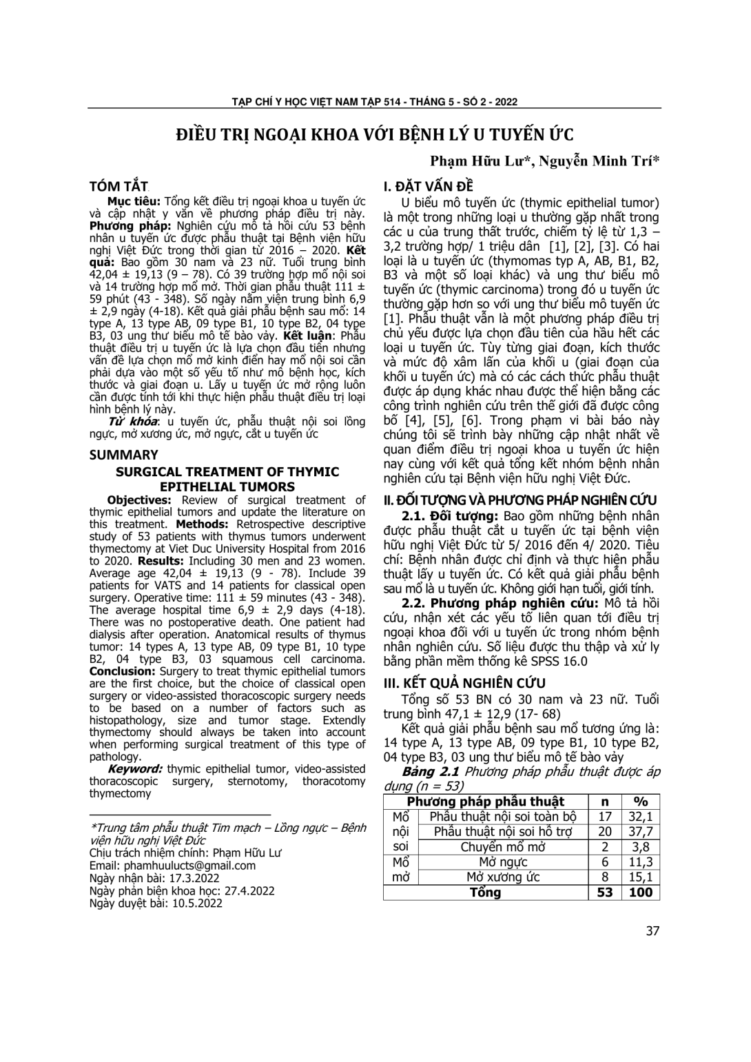 Tổng kết điều trị ngoại khoa u tuyến ức và cập nhật y văn về phương pháp điều trị này. Phương pháp: Nghiên cứu mô tả hồi cứu 53 bệnh nhân u tuyến ức được phẫu thuật tại Bệnh viện hữu nghị Việt Đức trong thời gian từ 2016 – 2020. Kết quả: Bao gồm 30 nam và 23 nữ. Tuổi trung bình 42,04 ± 19,13 (9 – 78). Có 39 trường hợp mổ nội soi và 14 trường hợp mổ mở. Thời gian phẫu thuật 111 ± 59 phút (43 - 348). Số ngày nằm viện trung bình 6,9 ± 2,9 ngày (4-18). Kết quả giải phẫu bệnh sau mổ: 14 type A, 13 type AB, 09 type B1, 10 type B2, 04 type B3, 03 ung thư biểu mô tế bào vảy. Kết luận: Phẫu thuật điều trị u tuyến ức là lựa chọn đầu tiên nhưng vấn đề lựa chọn mổ mở kinh điển hay mổ nội soi cần phải dựa vào một số yếu tố như mô bệnh học, kích thước và giai đoạn u. Lấy u tuyến ức mở rộng luôn cần được tính tới khi thực hiện phẫu thuật điều trị loại hình bệnh lý này.
