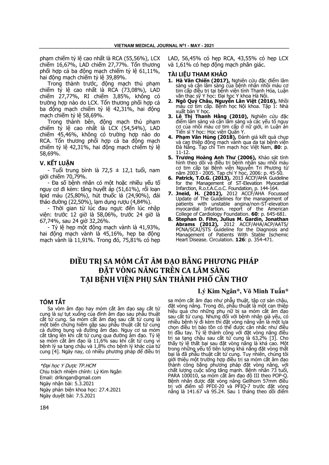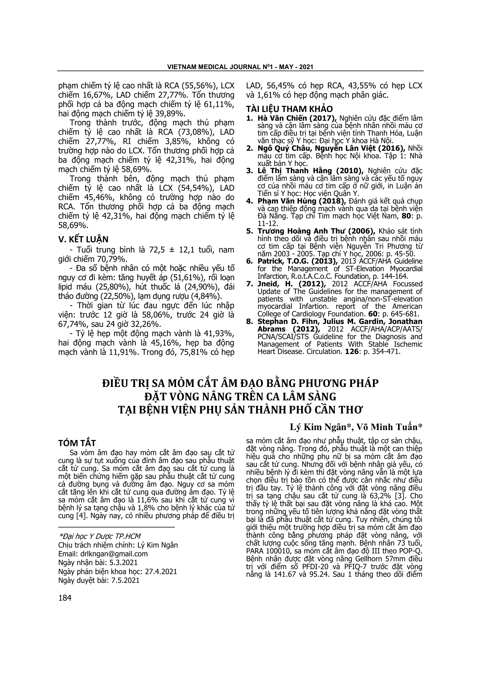 Sa vòm âm đạo hay mỏm cắt âm đạo sau cắt tử cung là sự tụt xuống của đỉnh âm đạo sau phẫu thuật cắt tử cung. Sa mỏm cắt âm đạo sau cắt tử cung là một biến chứng hiếm gặp sau phẫu thuật cắt tử cung cả đường bụng và đường âm đạo. Nguy cơ sa mỏm cắt tăng lên khi cắt tử cung qua đường âm đạo. Tỷ lệ sa mỏm cắt âm đạo là 11,6% sau khi cắt tử cung vì bệnh lý sa tạng chậu và 1,8% cho bệnh lý khác của tử cung [4]. Ngày nay, có nhiều phương pháp để điều trị sa mỏm cắt âm đạo như phẫu thuật, tập cơ sàn chậu, đặt vòng nâng. Trong đó, phẫu thuật là một can thiệp hiệu quả cho những phụ nữ bị sa mỏm cắt âm đạo sau cắt tử cung. Nhưng đối với bệnh nhân già yếu, có nhiều bệnh lý đi kèm thì đặt vòng nâng vẫn là một lựa chọn điều trị bảo tồn có thể được cân nhắc như điều trị đầu tay. Tỷ lệ thành công với đặt vòng nâng điều trị sa tạng chậu sau cắt tử cung là 63,2% [3]. Cho thấy tỷ lệ thất bại sau đặt vòng nâng là khá cao. Một trong những yếu tố tiên lượng khả năng đặt vòng thất bại là đã phẫu thuật cắt tử cung. Tuy nhiên, chúng tôi giới thiệu một trường hợp điều trị sa mỏm cắt âm đạo thành công bằng phương pháp đặt vòng nâng, với chất lượng cuộc sống tăng mạnh. Bệnh nhân 73 tuổi, PARA 100010, sa mỏm cắt âm đạo độ III theo POP-Q. Bệnh nhân được đặt vòng nâng Gellhorn 57mm điều trị với điểm số PFDI-20 và PFIQ-7 trước đặt vòng nâng là 141.67 và 95.24. Sau 1 tháng theo dõi điểm số PFDI-20 và PFIQ-7 được cải thiện đáng kể với điểm số là 27.08 và 14.29.