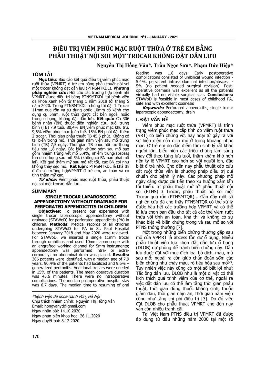 Báo cáo kết quả điều trị viêm phúc mạc ruột thừa ở trẻ em bằng phẫu thuật nội soi một trocar không đặt dẫn lưu. Phương pháp nghiên cứu: Hồi cứu các trường hợp bệnh nhi viêm phúc mạc ruột thừa được điều trị bằng phẫu thuật nội soi một trocar không đặt dẫn lưu tại bệnh viện đa khoa Xanh Pôn từ tháng 1 năm 2018 tới tháng 5 năm 2020. Trong phẫu thuật nội soi một trocar không đặt dẫn lưu: chúng tôi đặt 1 Trocar 11mm qua rốn và sử dụng optic 10mm có kênh cho dụng cụ 5mm, ruột thừa được cắt bên ngoài hoặc trong ổ bụng, không đặt dẫn lưu. Kết quả: Có 306 bệnh nhân (BN) thuộc diện nghiên cứu, tuổi trung bình (TB) 7,9 tuổi. 80,4% BN viêm phúc mạc khu trú, 9,6% viêm phúc mạc toàn thể. 15% BN phải đặt thêm 2 trocar. Thời gian phẫu thuật TB 45,6 phút. Không có tai biến trong mổ. Thời gian nằm viện sau mổ trung bình (TB) 7,5 ngày. Thời gian TB phục hồi lưu thông tiêu hóa 1,8 ngày. Các biến chứng sớm sau mổ bao gồm nhiễm trùng vết mổ 5,4%, nhiễm trùng/abscess tồn dư ổ bụng sau mổ 5% (không có BN nào phải mổ lại). Kết quả thẩm mỹ sau mổ rất tốt, các BN coi như không thấy sẹo mổ. Kết luận: phẫu thuật nội soi một trocar không đặt dẫn lưu là khả thi ở đa số trường hợp viêm phúc mạc ruột thừa ở trẻ em, an toàn và có tính thẩm mỹ cao.
