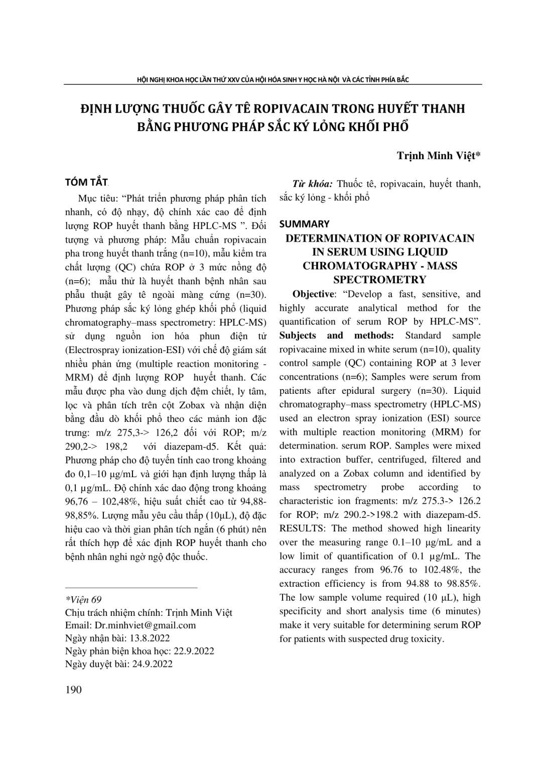 Nghiên cứu phát triển phương pháp phân tích nhanh, có độ nhạy, độ chính xác cao để định lượng ROP huyết thanh bằng HPLC-MS. Đối tượng và phương pháp: Mẫu chuẩn ropivacain pha trong huyết thanh trắng (n=10), mẫu kiểm tra chất lượng (QC) chứa ROP ở 3 mức nồng độ (n=6); mẫu thử là huyết thanh bệnh nhân sau phẫu thuật gây tê ngoài màng cứng (n=30). Phương pháp sắc ký lỏng ghép khối phổ (liquid chromatography–mass spectrometry: HPLC-MS) sử dụng nguồn ion hóa phun điện tử (Electrospray ionization-ESI) với chế độ giám sát nhiều phản ứng (multiple reaction monitoring - MRM) để định lượng ROP huyết thanh. Các mẫu được pha vào dung dịch đệm chiết, ly tâm, lọc và phân tích trên cột Zobax và nhận diện bằng đầu dò khối phổ theo các mảnh ion đặc trưng: m/z 275,3-> 126,2 đối với ROP; m/z 290,2-> 198,2 với diazepam-d5. Kết quả: Phương pháp cho độ tuyến tính cao trong khoảng đo 0,1–10 μg/mL và giới hạn định lượng thấp là 0,1 μg/mL. Độ chính xác dao động trong khoảng 96,76 – 102,48%, hiệu suất chiết cao từ 94,88- 98,85%. Lượng mẫu yêu cầu thấp (10μL), độ đặc hiệu cao và thời gian phân tích ngắn (6 phút) nên rất thích hợp để xác định ROP huyết thanh cho bệnh nhân nghi ngờ ngộ độc thuốc.