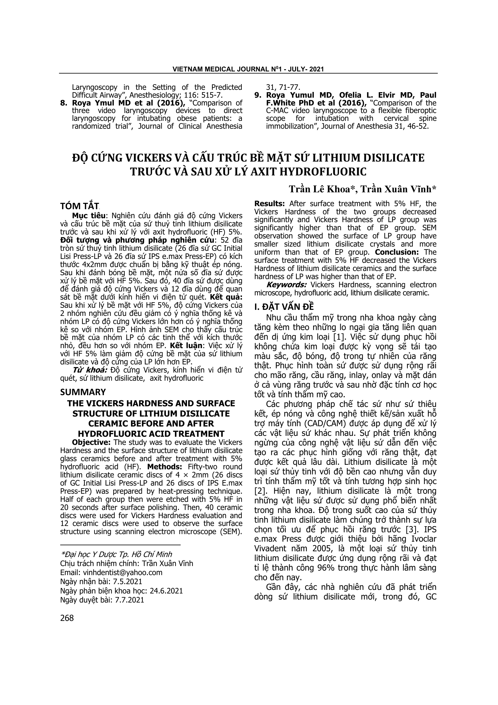 Nghiên cứu đánh giá độ cứng Vickers và cấu trúc bề mặt của sứ thuỷ tinh lithium disilicate trước và sau khi xử lý với axit hydrofluoric (HF) 5%. Đối tượng và phương pháp nghiên cứu: 52 đĩa tròn sứ thuỷ tinh lithium disilicate (26 đĩa sứ GC Initial Lisi Press-LP và 26 đĩa sứ IPS e.max Press-EP) có kích thước 4x2mm được chuẩn bị bằng kỹ thuật ép nóng. Sau khi đánh bóng bề mặt, một nửa số đĩa sứ được xử lý bề mặt với HF 5%. Sau đó, 40 đĩa sứ được dùng để đánh giá độ cứng Vickers và 12 đĩa dùng để quan sát bề mặt dưới kính hiển vi điện tử quét. Kết quả: Sau khi xử lý bề mặt với HF 5%, độ cứng Vickers của 2 nhóm nghiên cứu đều giảm có ý nghĩa thống kê và nhóm LP có độ cứng Vickers lớn hơn có ý nghĩa thống kê so với nhóm EP. Hình ảnh SEM cho thấy cấu trúc bề mặt của nhóm LP có các tinh thể với kích thước nhỏ, đều hơn so với nhóm EP. Kết luận: Việc xử lý với HF 5% làm giảm độ cứng bề mặt của sứ lithium disilicate và độ cứng của LP lớn hơn EP.