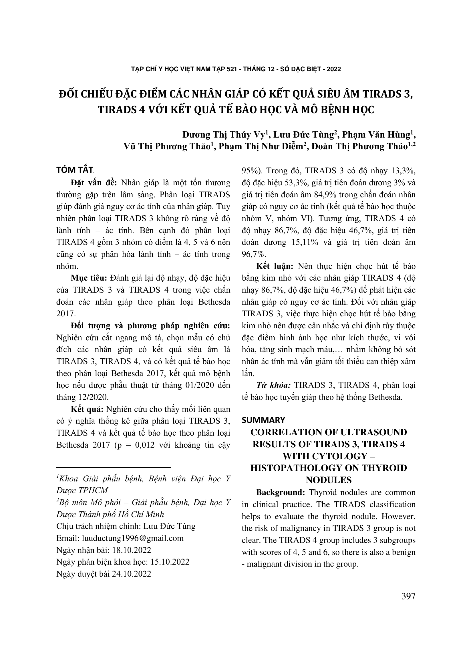 Đánh giá lại độ nhạy, độ đặc hiệu của TIRADS 3 và TIRADS 4 trong việc chẩn đoán các nhân giáp theo phân loại Bethesda 2017. Đối tượng và phương pháp nghiên cứu: Nghiên cứu cắt ngang mô tả, chọn mẫu có chủ đích các nhân giáp có kết quả siêu âm là TIRADS 3, TIRADS 4, và có kết quả tế bào học theo phân loại Bethesda 2017, kết quả mô bệnh học nếu được phẫu thuật từ tháng 01/2020 đến tháng 12/2020. Kết quả: Nghiên cứu cho thấy mối liên quan có ý nghĩa thống kê giữa phân loại TIRADS 3, TIRADS 4 và kết quả tế bào học theo phân loại Bethesda 2017 (p = 0,012 với khoảng tin cậy 95%). Trong đó, TIRADS 3 có độ nhạy 13,3%, độ đặc hiệu 53,3%, giá trị tiên đoán dương 3% và giá trị tiên đoán âm 84,9% trong chẩn đoán nhân giáp có nguy cơ ác tính (kết quả tế bào học thuộc nhóm V, nhóm VI). Tương ứng, TIRADS 4 có độ nhạy 86,7%, độ đặc hiệu 46,7%, giá trị tiên đoán dương 15,11% và giá trị tiên đoán âm 96,7%. Kết luận: Nên thực hiện chọc hút tế bào bằng kim nhỏ với các nhân giáp TIRADS 4 (độ nhạy 86,7%, độ đặc hiệu 46,7%) để phát hiện các nhân giáp có nguy cơ ác tính. Đối với nhân giáp TIRADS 3, việc thực hiện chọc hút tế bào bằng kim nhỏ nên được cân nhắc và chỉ định tùy thuộc đặc điểm hình ảnh học như kích thước, vi vôi hóa, tăng sinh mạch máu,… nhằm không bỏ sót nhân ác tính mà vẫn giảm tối thiểu can thiệp xâm lấn.