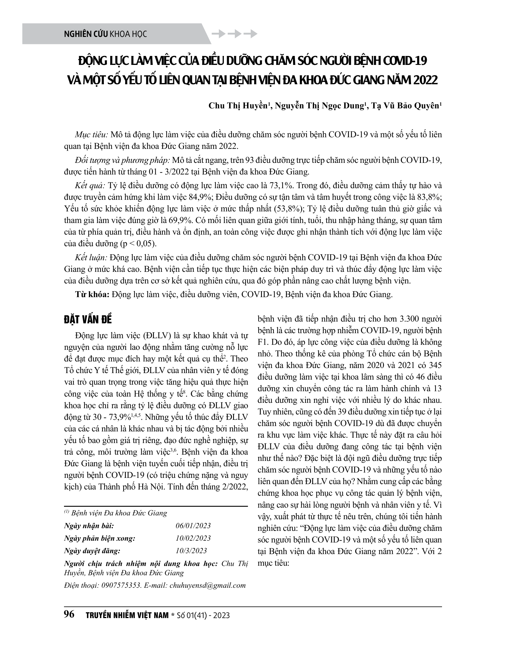 Mô tả động lực làm việc của điều dưỡng chăm sóc người bệnh COVID-19 và một số yếu tố liên quan tại Bệnh viện đa khoa Đức Giang năm 2022. Đối tượng và phương pháp: Mô tả cắt ngang, trên 93 điều dưỡng trực tiếp chăm sóc người bệnh COVID-19, được tiến hành từ tháng 01 – 3/2022 tại Bệnh viện đa khoa Đức Giang. Kết quả: Tỷ lệ điều dưỡng có động lực làm việc cao là 73,1%. Trong đó, điều dưỡng cảm thấy tự hào và được truyền cảm hứng khi làm việc 84,9%; Điều dưỡng có sự tận tâm và tâm huyết trong công việc là 83,8%; Yếu tố sức khỏe khiến động lực làm việc ở mức thấp nhất (53,8%); Tỷ lệ điều dưỡng tuân thủ giờ giấc và tham gia làm việc đúng giờ là 69,9%. Có mối liên quan giữa giới tính, tuổi, thu nhập hàng tháng, sự quan tâm của từ phía quản trị, điều hành và ổn định, an toàn công việc được ghi nhận thành tích với động lực làm việc của điều dưỡng (p<0,05). Kết luận: Động lực làm việc của điều dưỡng chăm sóc người bệnh COVID-19 tại Bệnh viện đa khoa Đức Giang ở mức khá cao. Bệnh viện cần tiếp tục thực hiện các biện pháp duy trì và thúc đẩy động lực làm việc của điều dưỡng dựa trên cơ sở kết quả nghiên cứu, qua đó góp phần nâng cao chất lượng bệnh viện.