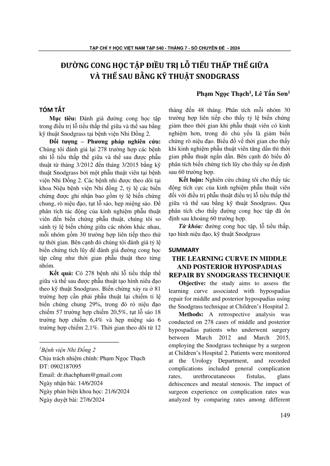 Đánh giá đường cong học tập trong điều trị lỗ tiểu thấp thể giữa và thể sau bằng kỹ thuật Snodgrass tại bệnh viện Nhi Đồng 2. Đối tượng – Phương pháp nghiên cứu: Chúng tôi đánh giá lại 278 trường hợp các bệnh nhi lỗ tiểu thấp thể giữa và thể sau được phẫu thuật từ tháng 3/2012 đến tháng 3/2015 bằng kỹ thuật Snodgrass bởi một phẫu thuật viên tại bệnh viện Nhi Đồng 2. Các bệnh nhi được theo dõi tại khoa Niệu bệnh viện Nhi đồng 2, tỷ lệ các biến chứng được ghi nhận bao gồm tỷ lệ biến chứng chung, rò niệu đạo, tụt lỗ sáo, hẹp miệng sáo. Để phân tích tác động của kinh nghiệm phẫu thuật viên đến biến chứng phẫu thuật, chúng tôi so sánh tỷ lệ biến chứng giữa các nhóm khác nhau, mỗi nhóm gồm 30 trường hợp liên tiếp theo thứ tự thời gian. Bên cạnh đó chúng tôi đánh giá tỷ lệ biến chứng tích lũy để đánh giá đường cong học tập cũng như thời gian phẫu thuật theo từng nhóm. Kết quả: Có 278 bệnh nhi lỗ tiểu thấp thể giữa và thể sau được phẫu thuật tạo hình niêu đạo theo kỹ thuật Snodgrass. Biến chứng xảy ra ở 81 trường hợp cần phải phẫu thuật lại chiếm tỉ lệ biến chứng chung 29%, trong đó rò niệu đạo chiếm 57 trường hợp chiếm 20,5%, tụt lỗ sáo 18 trường hợp chiếm 6,4% và hẹp miệng sáo 6 trường hợp chiếm 2,1%. Thời gian theo dõi từ 12 tháng đến 48 tháng. Phân tích mỗi nhóm 30 trường hợp liên tiếp cho thấy tỷ lệ biến chứng giảm theo thời gian khi phẫu thuật viên có kinh nghiệm hơn, trong đó chủ yếu là giảm biến chứng rò niệu đạo. Biểu đồ về thời gian cho thấy khi kinh nghiệm phẫu thuật viên tăng dần thì thời gian phẫu thuật ngắn dần. Bên cạnh đó biểu đồ phân tích biến chứng tích lũy cho thấy sự ổn định sau 60 trường hợp. Kết luận: Nghiên cứu chúng tôi cho thấy tác động tích cực của kinh nghiệm phẫu thuật viên đối với điều trị phẫu thuật điều trị lỗ tiểu thấp thể giữa và thể sau bằng kỹ thuật Snodgrass. Qua phân tích cho thấy đường cong học tập đã ổn định sau khoảng 60 trường hợp.
