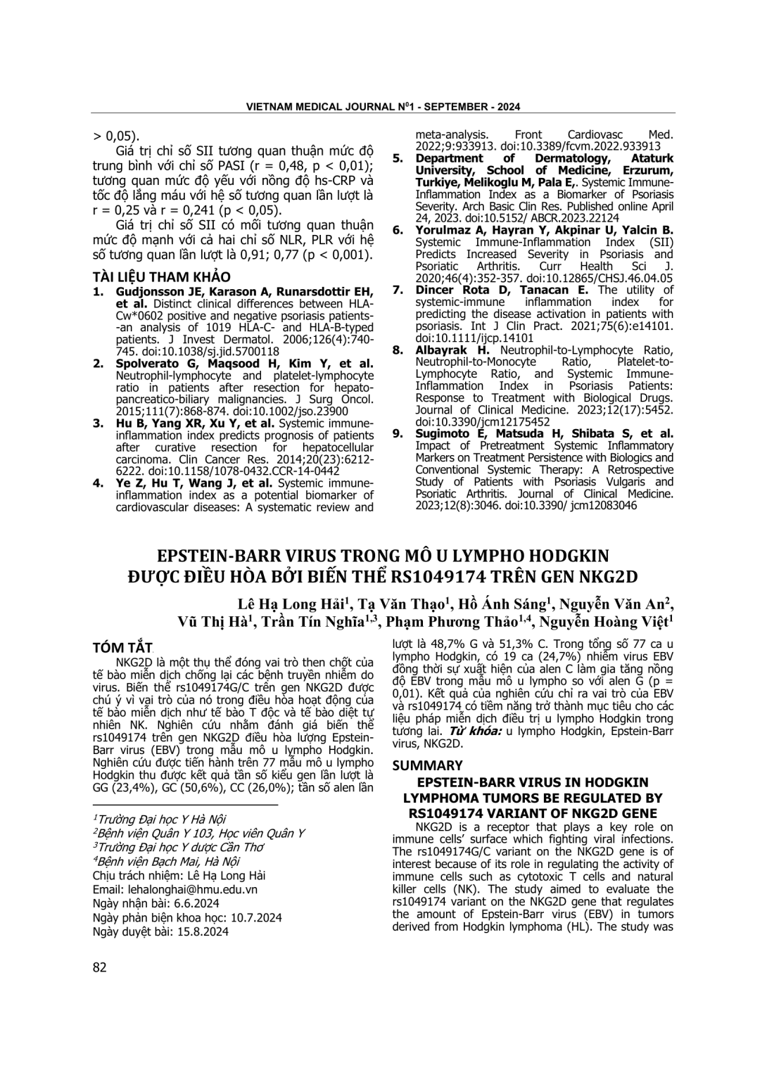 NKG2D là một thụ thể đóng vai trò then chốt của tế bào miễn dịch chống lại các bệnh truyền nhiễm do virus. Biến thể rs1049174G/C trên gen NKG2D được chú ý vì vai trò của nó trong điều hòa hoạt động của tế bào miễn dịch như tế bào T độc và tế bào diệt tự nhiên NK. Nghiên cứu nhằm đánh giá biến thể rs1049174 trên gen NKG2D điều hòa lượng Epstein-Barr virus (EBV) trong mẫu mô u lympho Hodgkin. Nghiên cứu được tiến hành trên 77 mẫu mô u lympho Hodgkin thu được kết quả tần số kiểu gen lần lượt là GG (23,4%), GC (50,6%), CC (26,0%); tần số alen lần lượt là 48,7% G và 51,3% C. Trong tổng số 77 ca u lympho Hodgkin, có 19 ca (24,7%) nhiễm virus EBV đồng thời sự xuất hiện của alen C làm gia tăng nồng độ EBV trong mẫu mô u lympho so với alen G (p = 0,01). Kết quả của nghiên cứu chỉ ra vai trò của EBV và rs1049174 có tiềm năng trở thành mục tiêu cho các liệu pháp miễn dịch điều trị u lympho Hodgkin trong tương lai.