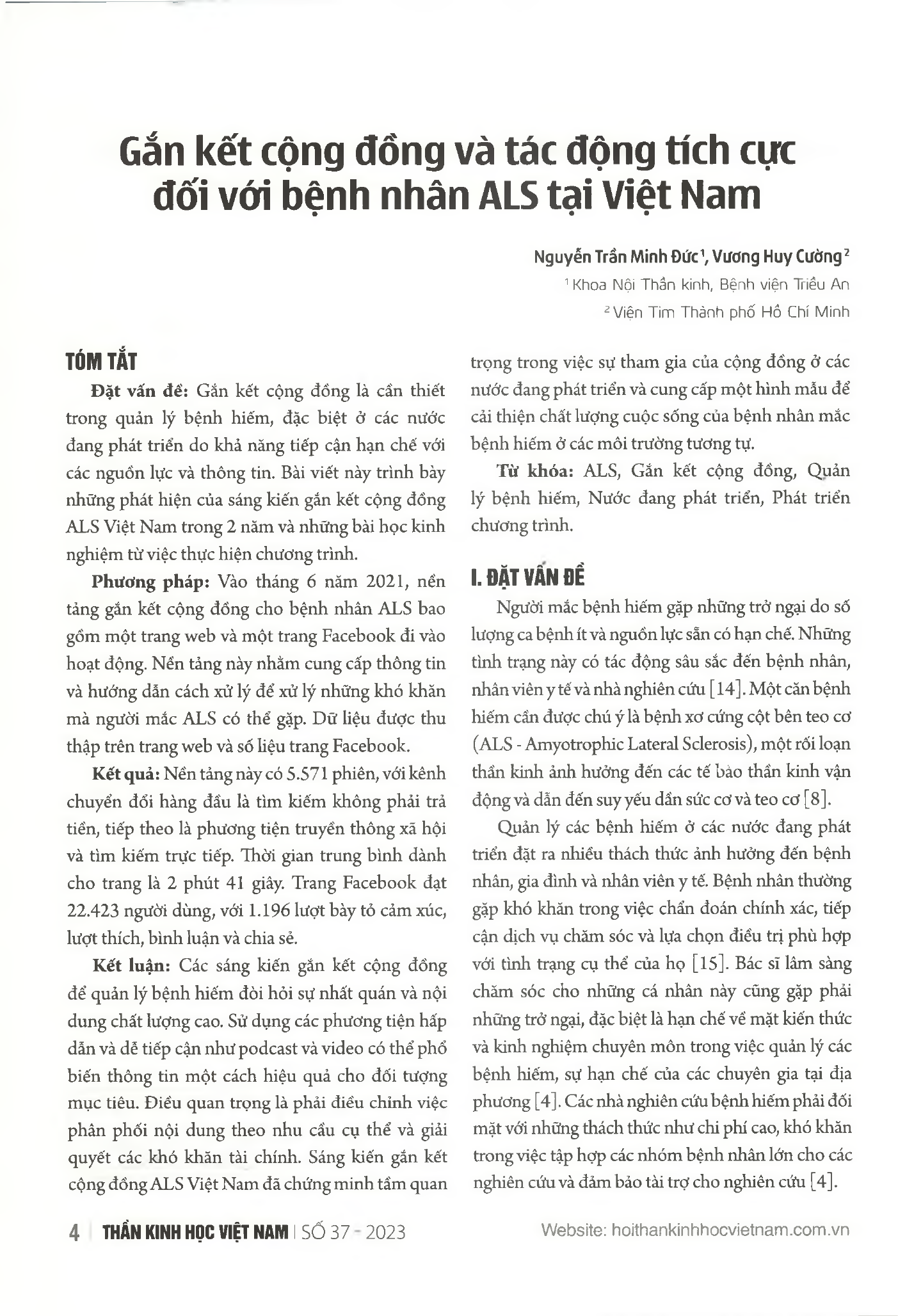 Gắn kết cộng đồng là cần thiết trong quản lý bệnh hiếm, đặc biệt ở các nước đang phát triển do khả năng tiếp cận hạn chế với các nguồn lực và thông tin. Bài viết này trình bày những phát hiện của sáng kiến gắn kết cộng đồng ALS Việt Nam trong 2 năm và những bài học kinh nghiệm từ việc thực hiện chương trình. Phương pháp: Vào tháng 6 năm 2021, nền tảng gắn kết cộng đồng cho bệnh nhân ALS bao gồm một trang web và một trang Facebook đi vào hoạt động. Nền tảng này nhằm cung cấp thông tin và hướng dẫn cách xử lý để xử lý những khó khăn mà người mắc ALS có thể gặp. Dữ liệu được thu thập trên trang web và số liệu trang Facebook. Kết quả: Nền tảng này có 5.571 phiên, với kênh chuyển đổi hàng đầu là tìm kiếm không phải trả tiền, tiếp theo là phương tiện truyền thông xã hội và tìm kiếm trực tiếp. Thời gian trung bình dành cho trang là 2 phút 41 giây. Trang Facebook đạt 22.423 người dùng, với 1.196 lượt bày tỏ cảm xúc, lượt thích, bình luận và chia sẻ. Kết luận: Các sáng kiến gắn kết cộng đồng để quản lý bệnh hiếm đòi hỏi sự nhất quán và nội dung chất lượng cao. Sử dụng các phương tiện hấp dẫn và dễ tiếp cận như podcast và video có thể phổ biến thông tin một cách hiệu quả cho đối tượng mục tiêu. Điều quan trọng là phải điều chỉnh việc phân phối nội dung theo nhu cầu cụ thể và giải quyết các khó khăn tài chính. Sáng kiến gắn kết cộng đồng ALS Việt Nam đã chứng minh tầm quan trọng trong việc sự tham gia của cộng đồng ở các nước đang phát triển và cung cấp một hình mẫu để cải thiện chất lượng cuộc sống của bệnh nhân mắc bệnh hiếm ở các môi trường tương tự.