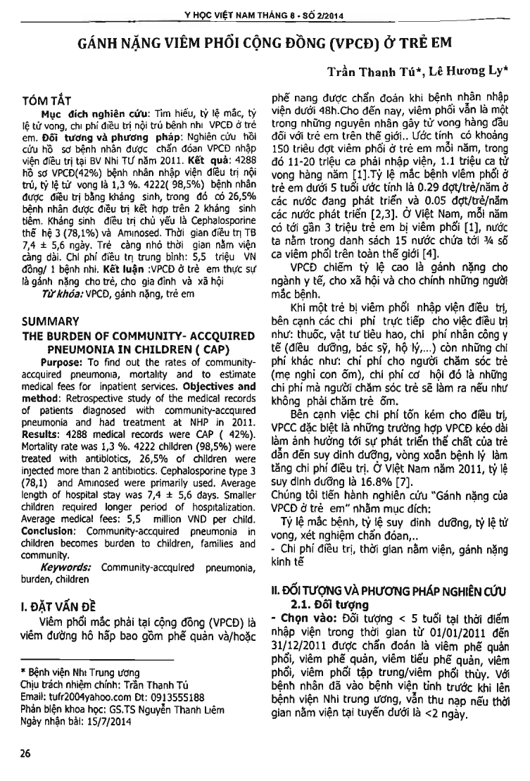 Purpose: To find out the rates of communityaccquired pneumonia, mortality and to estimate medical fees for inpatient services. Objectives and method: Retrospective study of the medical records of patients diagnosed with community-accquired pneumonia and had treatment at NHP in 2011. Results: 4288 medical records were CAP (42 percent). Mortality rate was 1,3 percent. 4222 children (98,5 percent) were treated with antibiotics, 26,5 percent of children were Injected more than 2 antibiotics. Cephalosporine type 3 (78,1) and Aminosed were primarily used. Average length of hospital stay was 7,4 + or - 5,6 days. Smaller children required longer period of hospitalization. Average medical fees: 5,5 million VND per child. Conclusion: Community-accquired pneumonia in children becomes burden to children, families and community.